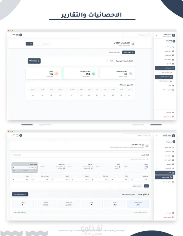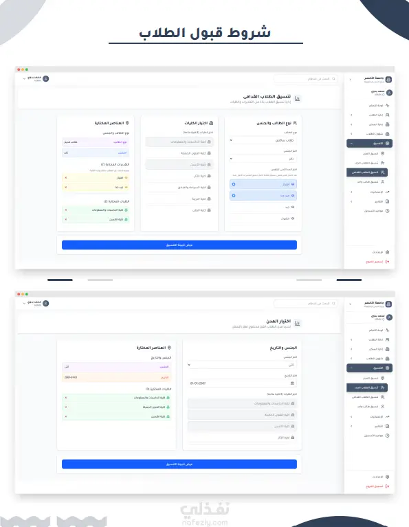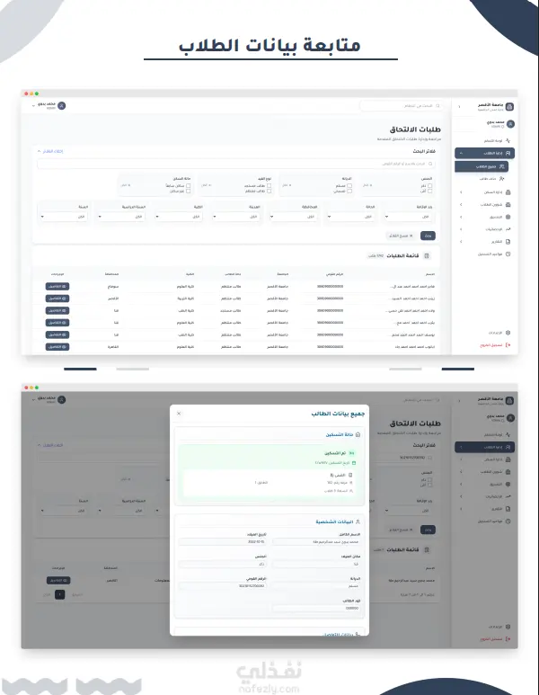 - نظام متطور يتيح لآلاف الطلاب تقديم طلبات الالتحاق بالسكن الجامعي أونلاين. - تعبئة سهلة للبيانات الشخصية والأكاديمية ومتطلبات السكن. - نظام استعلام فوري يتيح للطالب متابعة حالة طلبه (قبول، رفض، قيد الانتظار). -عرض واضح لمواعيد التقديم المتاحة لكل فئة من الطلاب (جدد، قدامى، ذكور، إناث). لوحة تحكم الإدارة: - لوحة تحكم مركزية شاملة لمتابعة كافة إحصائيات وبيانات الطلاب المتقدمين. - نظام بحث متقدم جداً لفرز الطلبات (حسب الكلية، السنة الدراسية، المحافظة، التقدير، إلخ). - نظام "تنسيق" آلي لتحديد شروط القبول وتوزيع الطلاب المقبولين بناءً على قواعد الإدارة. - إدارة كاملة للمباني والغرف وتسكين الطلاب المقبولين في غرفهم إلكترونياً. عرض تقارير وإحصائيات بيانية لحظية لتوزيع الطلاب (حسب الجنس، الديانة، الكلية، ...). التقنيات المستخدمة: الواجهة الخلفية (Backend): باستخدام Java Spring Boot لبناء نظام آمن، مستقر، وقادر على معالجة آلاف الطلبات. قاعدة البيانات: PostgreSQL لضمان تخزين البيانات الضخمة وأداء الاستعلامات بكفاءة. الواجهة الأمامية (Frontend): باستخدام React.js و Tailwind CSS لبناء لوحة تحكم سريعة، تفاعلية، ومتجاوبة.