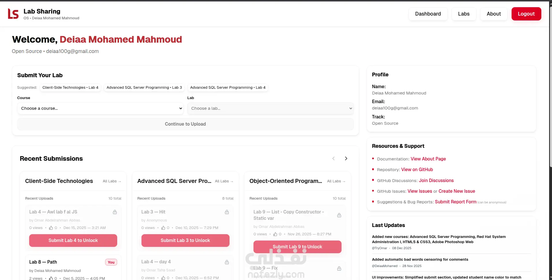 قمت بتصميم وتطوير منصة ويب باسم Lab Sharing تهدف إلى مشاركة الحلول والمواد العملية بين المتدربين بطريقة منظمة وسهلة، مما يساعد على تبادل المعرفة وتسريع عملية التعلم داخل بيئة تدريبية تعاونية. تم بناء المنصة باستخدام Next.js وReact مع TypeScript لتوفير أداء عالي، وتجربة مستخدم سلسة، وهيكل كود قوي وقابل للتوسع. كما تم الاعتماد على Supabase كحل متكامل لإدارة قاعدة البيانات، والمصادقة (Authentication)، والتخزين، مما ساهم في تسريع التطوير وضمان الأمان. تتضمن المنصة مجموعة من الخصائص الأساسية مثل: تسجيل الدخول وإنشاء الحسابات للمتدربين رفع ومشاركة الحلول والملفات تنظيم المحتوى حسب المعامل أو الموضوعات واجهة مستخدم بسيطة وسهلة الاستخدام دعم العمل الجماعي وتبادل الخبرات بين المتدربين تم الاهتمام بتطبيق أفضل ممارسات تطوير الويب الحديثة، مع التركيز على الأداء، وقابلية التوسع، وتجربة المستخدم، مما يجعل المنصة مناسبة للاستخدام في البيئات التعليمية والتدريبية.