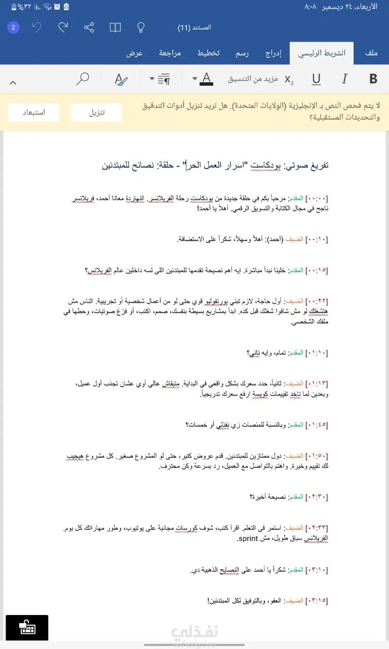 تفريغ صوتي احترافي لمقابلة في بودكاست عن "رحله الفريلانسر"