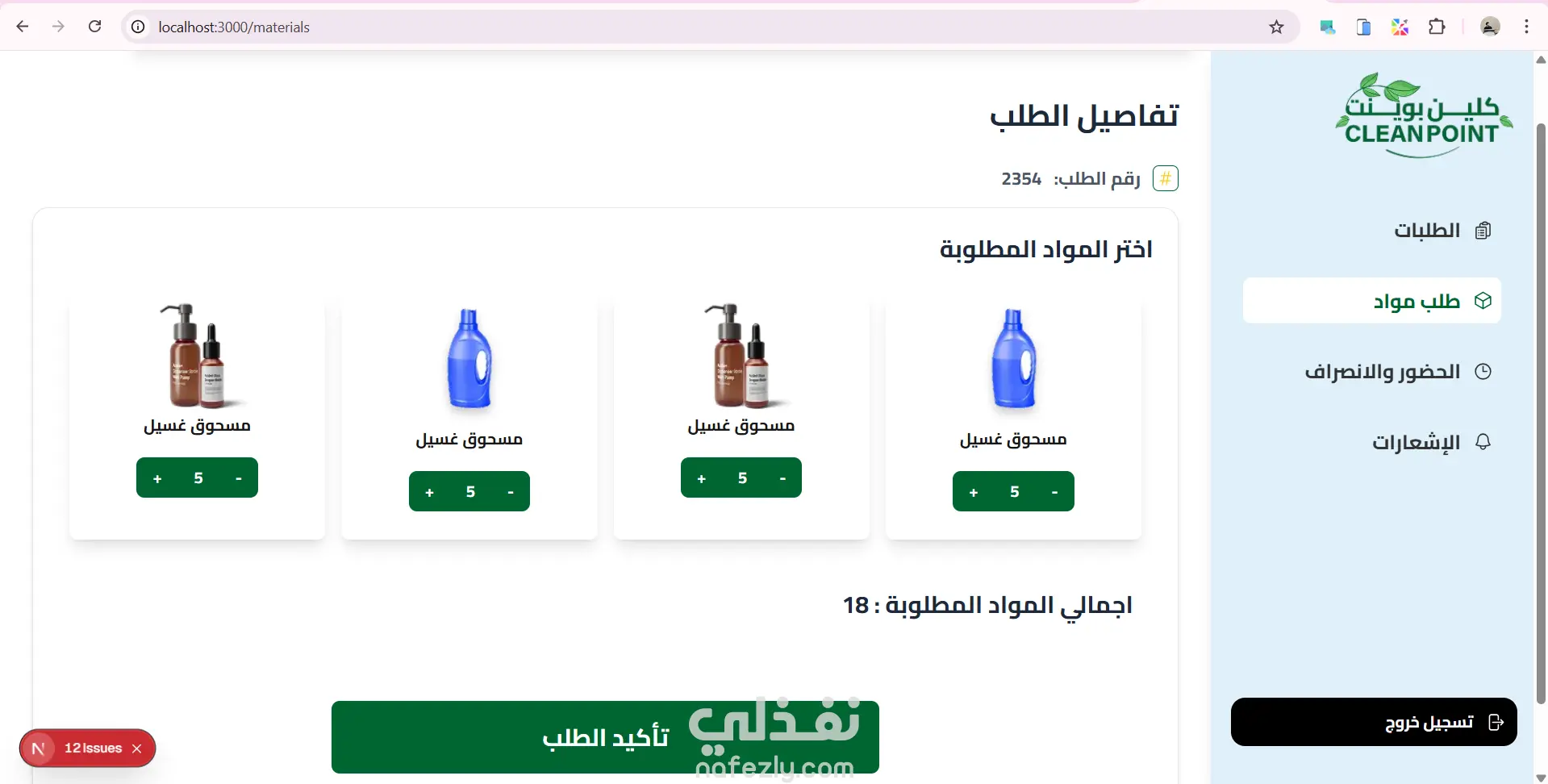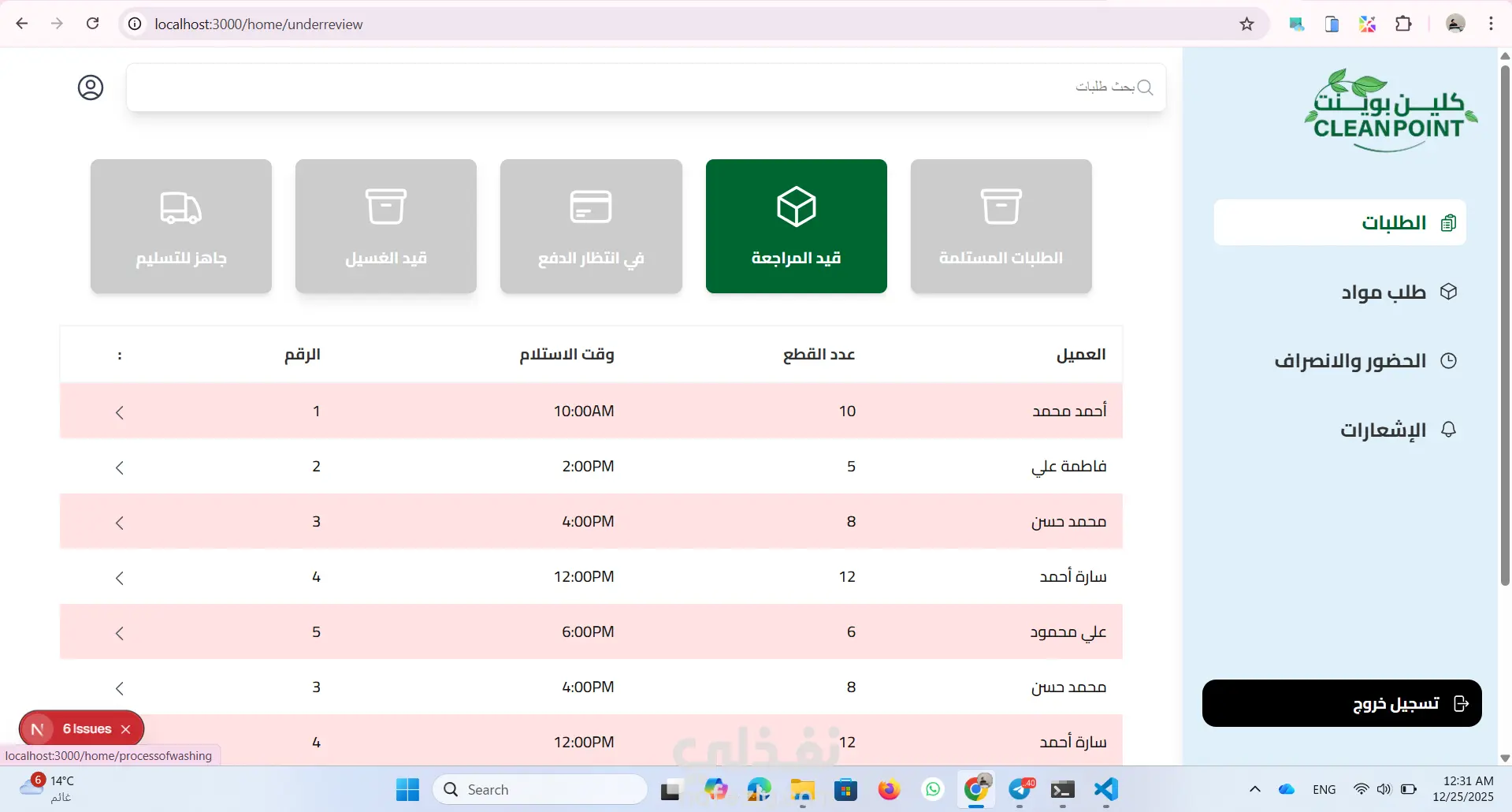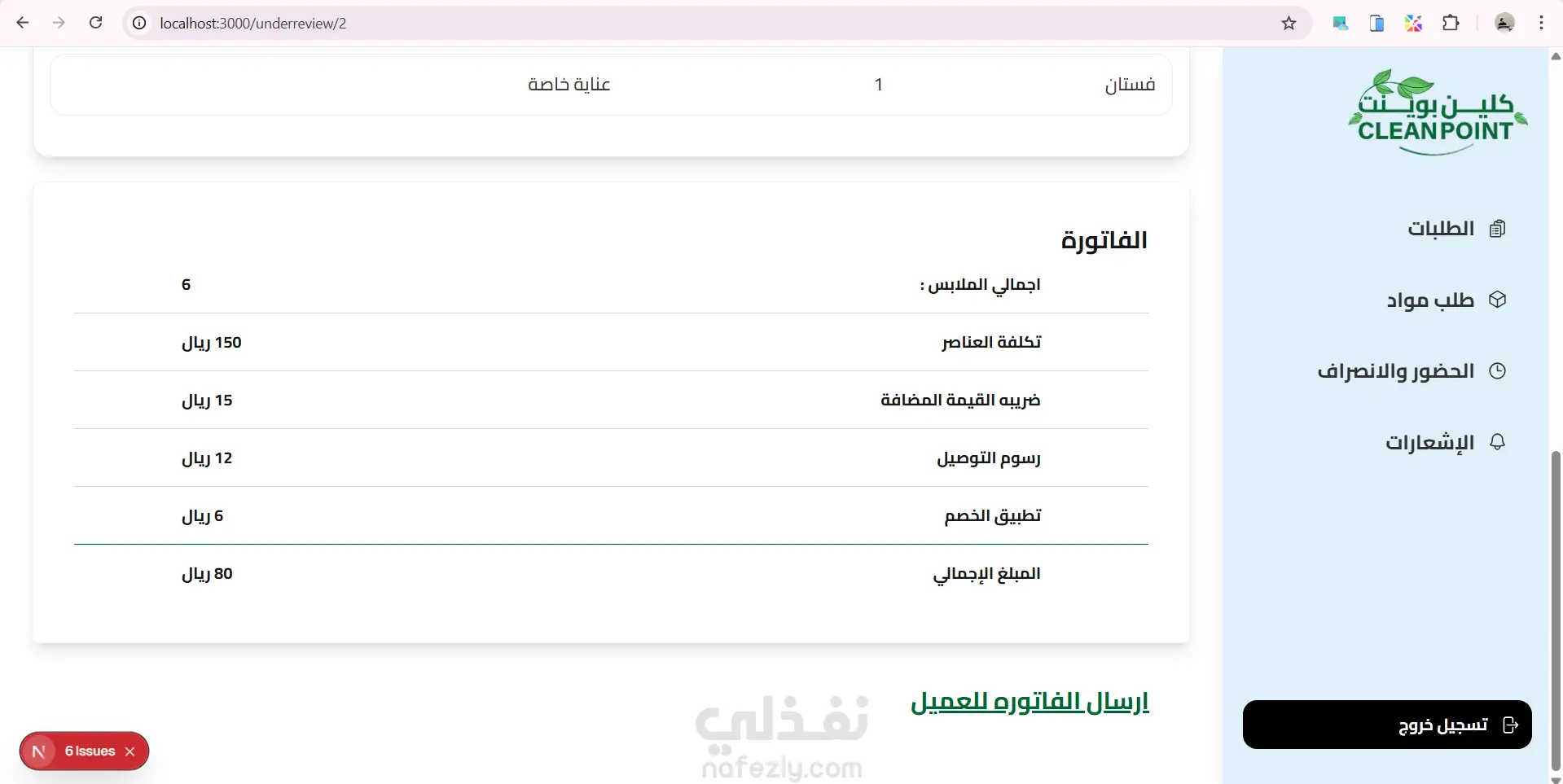 موقع داشبورد ل ادارة مغسلة من خلال متابة الطلبات الجديدة والطلبات قيد الغسيل والطلبات اللى انتهى غسيلها والطلبات الجاهزة للاستلام ومتابعة المواد المطلوبة للغسيل وارسال الفاتورة للعميل وكمان نظام حضور وانصراف للعمال استخدمت react.js and next.js tailwind css for design axios for fetch api
