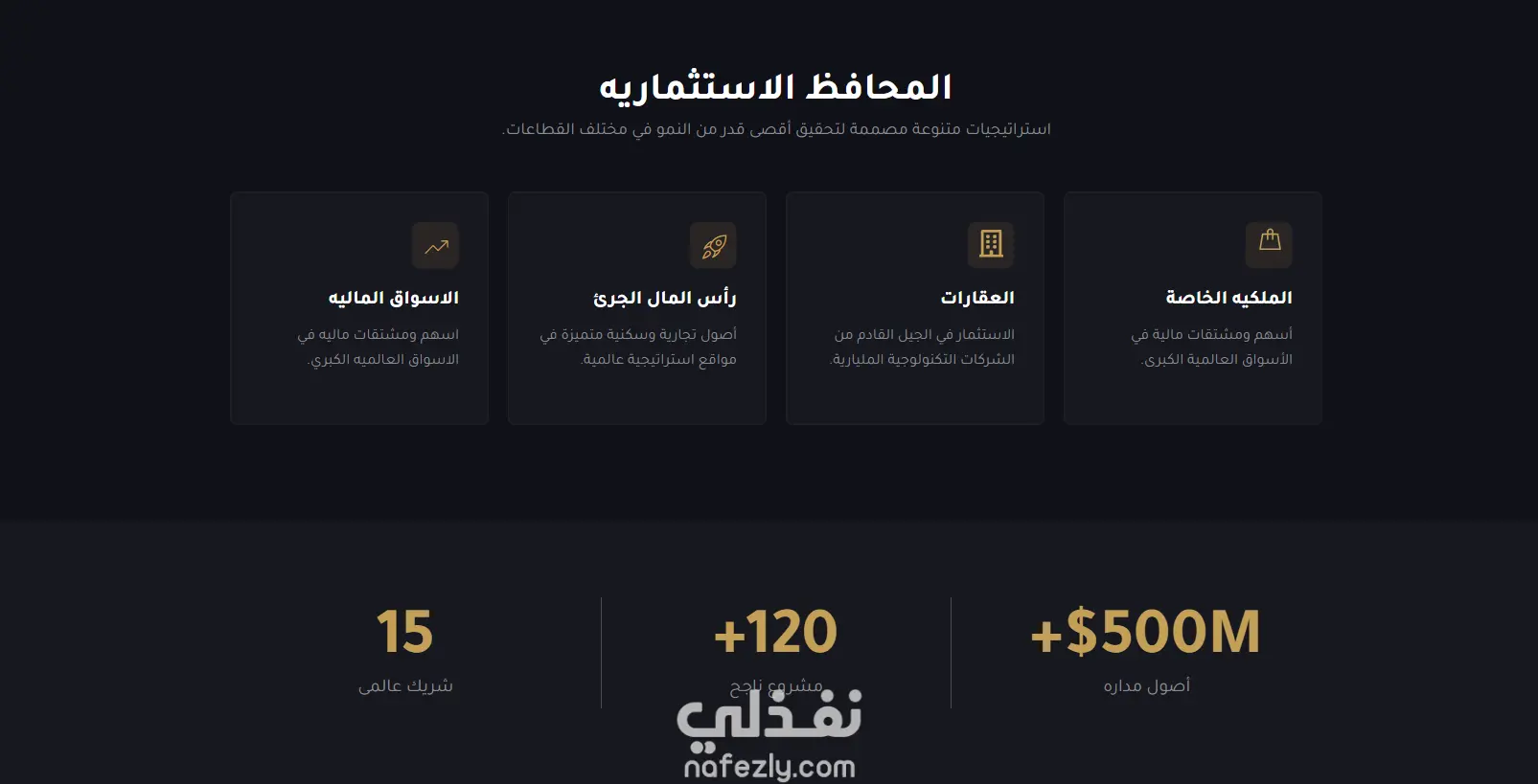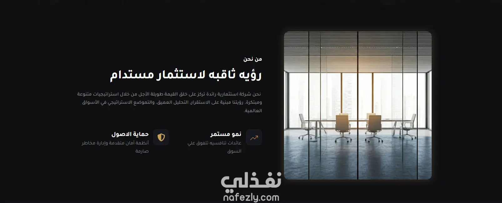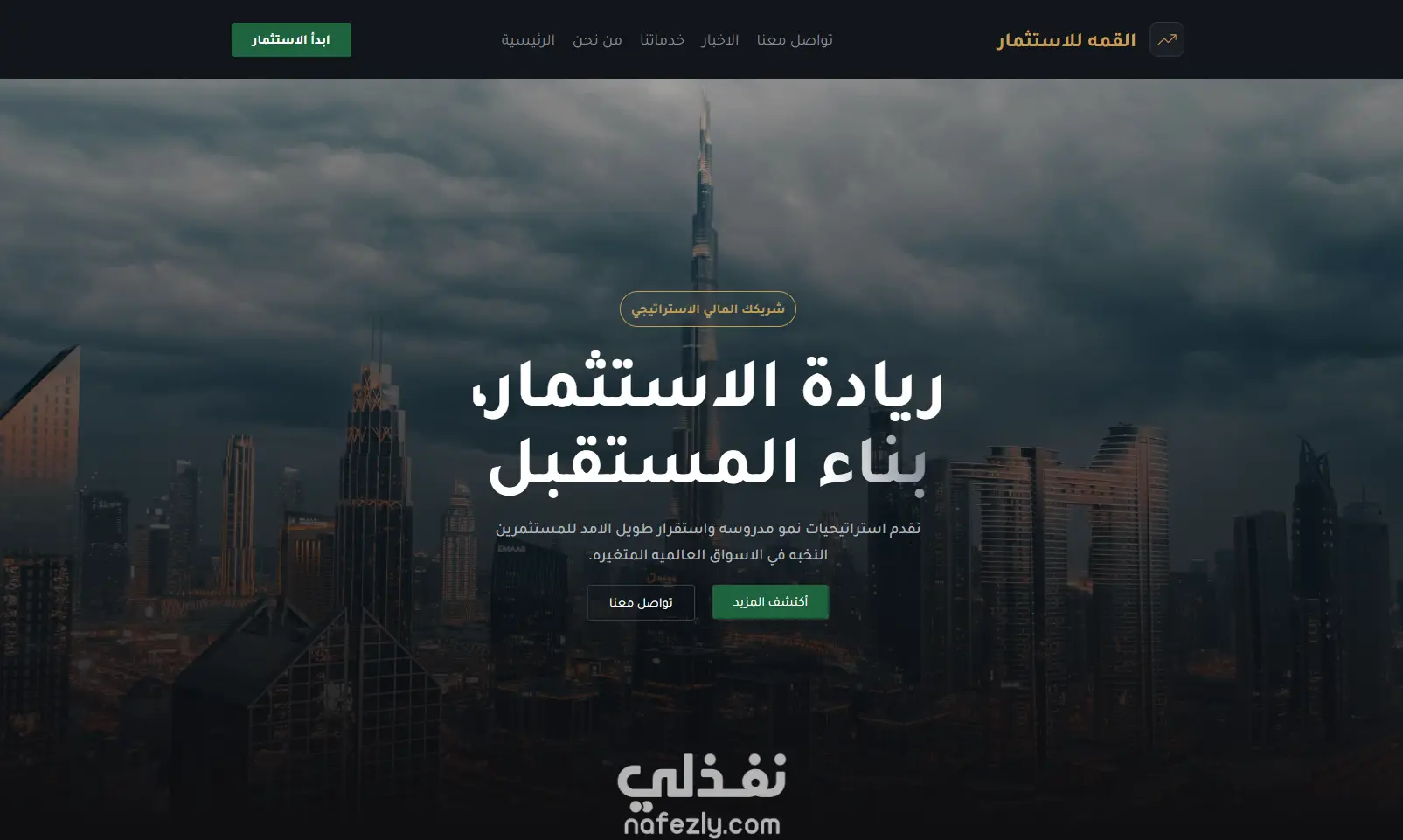 "مشروع تصميم وتطوير صفحة هبوط (Landing Page) عصرية لشركة استثمار، تم بناؤها بالكامل باللغة العربية مع مراعاة أدق تفاصيل الاتجاه من اليمين لليسار (RTL). يركز المشروع على تقديم تجربة مستخدم سلسة واحترافية تجمع بين الفخامة والوظيفة التقنية." أهم مميزات المشروع: تصميم عصري (Modern UI): استخدام نمط "Dark Mode" مع لمسات ذهبية ليعكس القوة والثقة المالية. دعم كامل للغة العربية (RTL): تنسيق دقيق للنصوص والخطوط لضمان أفضل تجربة قراءة للمستخدم العربي. متجاوب تماماً (Responsive): تصميم مرن يتكيف مع جميع الشاشات (Mobile, Tablet, Desktop) لضمان وصول العميل من أي جهاز. سرعة الأداء: تم تحسين الكود والصور لضمان تحميل الصفحة بسرعة فائقة (High Performance). نموذج تواصل فعال (Contact Form): دمج فورم تواصل مدمج وجاهز لاستقبال بيانات العملاء لزيادة معدل التحويل (Conversion Rate).