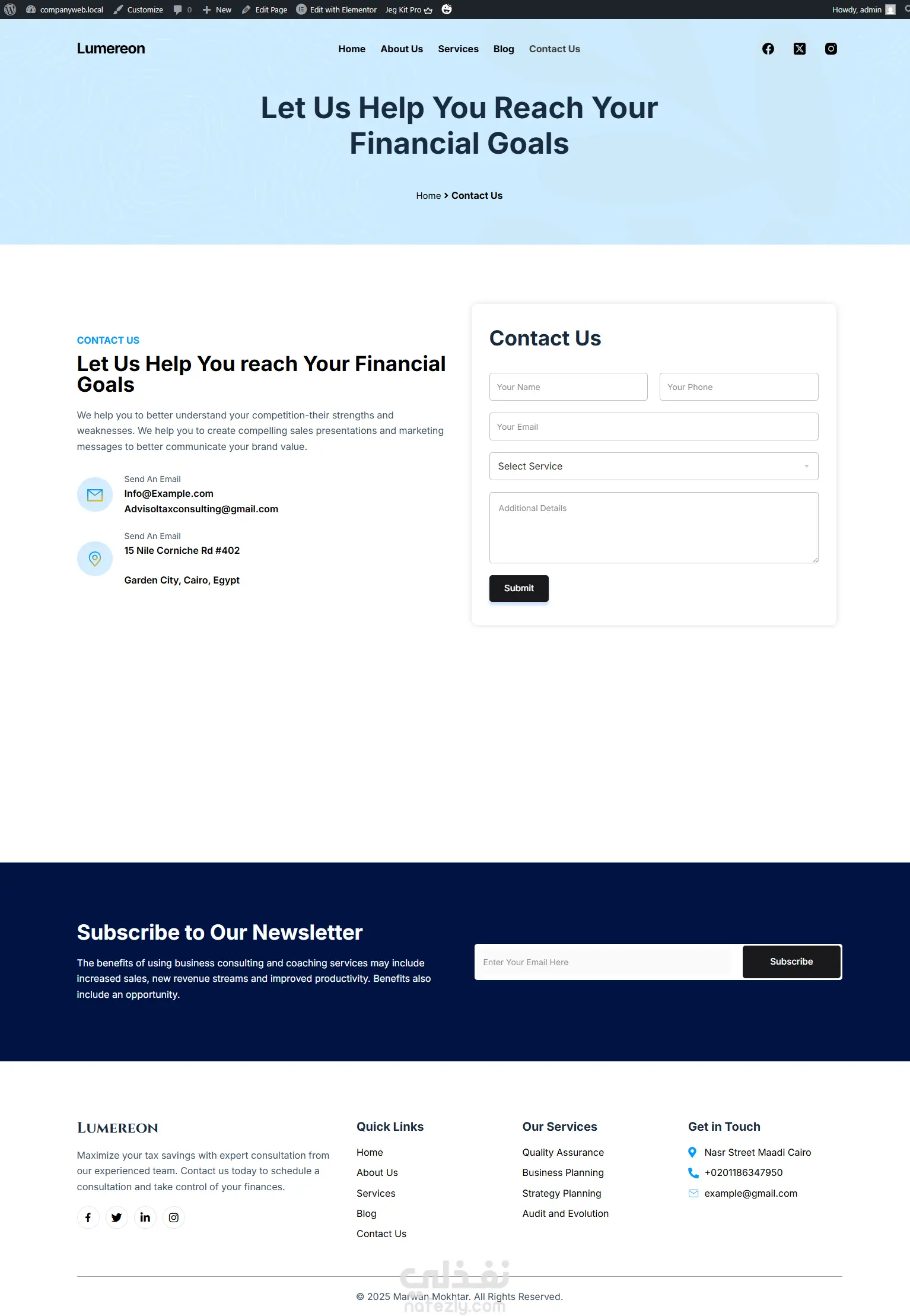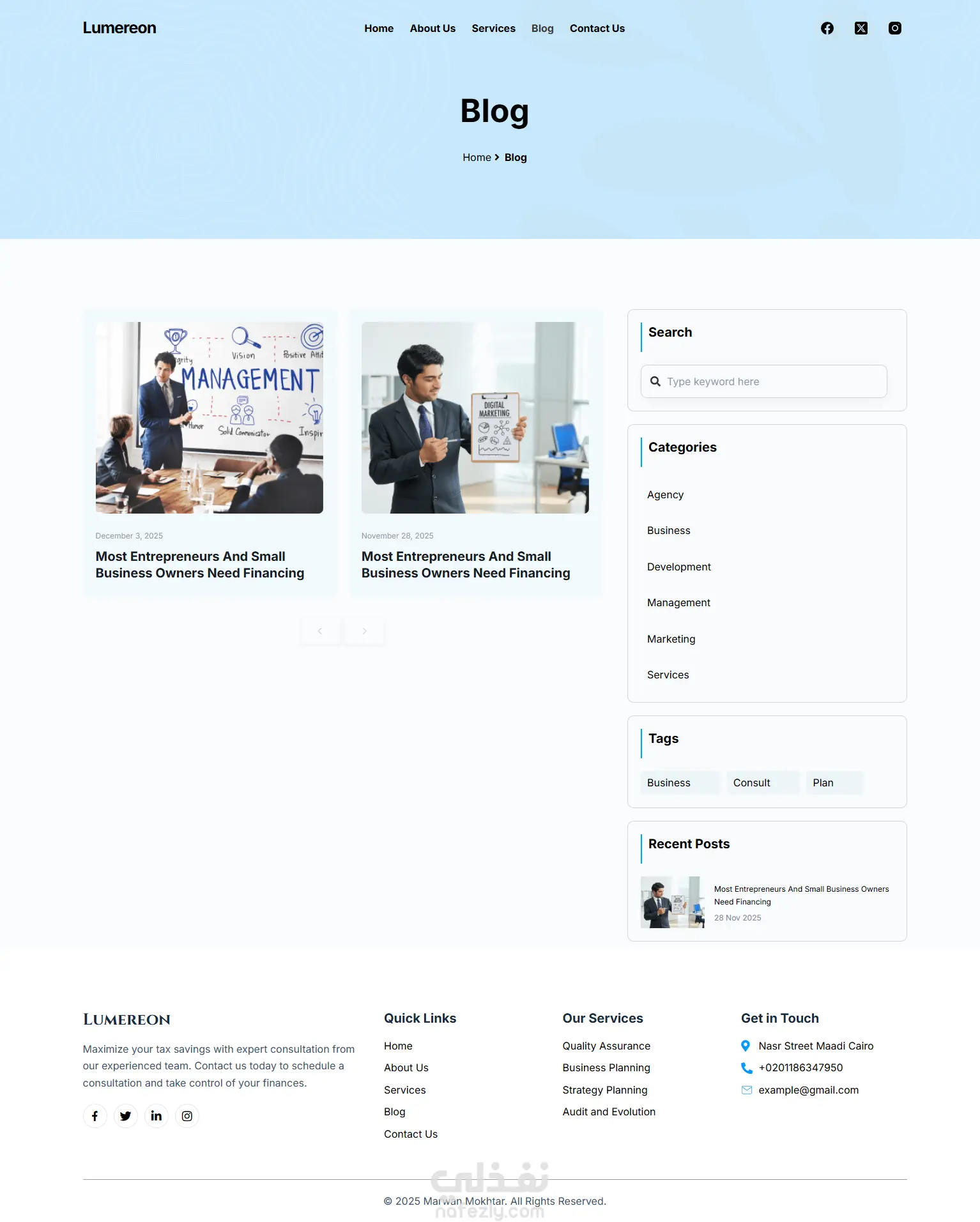 مشروع تصميم وتطوير موقع إلكتروني ضخم وشامل يتكون من 8 صفحات أساسية، مصمم خصيصاً لشركات الاستشارات والخدمات التي تسعى لبناء حضور رقمي قوي واحترافي. الموقع ليس مجرد واجهة عرض، بل هو نظام متكامل لإدارة المحتوى والتفاعل مع العملاء. أبرز ما يتضمنه المشروع: بنية تحتية متكاملة: تصميم الصفحة الرئيسية (Home)، الخدمات (Services)، وصفحات الاتصال (Contact Us). نظام تدوين متطور (Advanced Blog System): بناء صفحات المدونة بالكامل، بما في ذلك صفحة الأرشيف، وتصنيفات المقالات (Categories)، والوسوم (Tags). تصميم المقال المنفرد (Single Post Layout): تنسيق مخصص للمحتوى النصي لضمان أفضل تجربة قراءة وتفاعل. تجربة مستخدم حركية (Dynamic Animations): إضافة لمسات حركية عصرية (Modern Animations) تعطي الموقع حيوية واحترافية دون التأثير على سرعة التصفح. تصميم متجاوب بالكامل (Fully Responsive): الموقع يعمل بكفاءة مثالية على كافة الشاشات (Desktop, Tablet, Mobile). توزيع ذكي للمحتوى: تم التركيز على هيكلة المعلومات (Information Architecture) لسهولة تنقل العميل بين الخدمات والمقالات بسلاسة. المواصفات الفنية: عدد الصفحات: 8 صفحات فرعية ورئيسية. النمط: Modern & Corporate Identity. المميزات: Search Engine Optimized (SEO Friendly) لتسهيل ظهور المقالات في محركات البحث.
