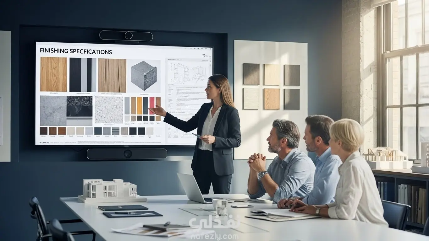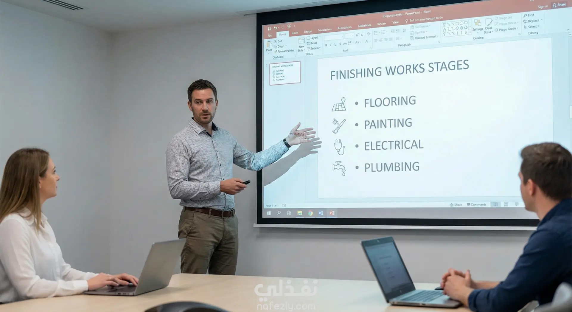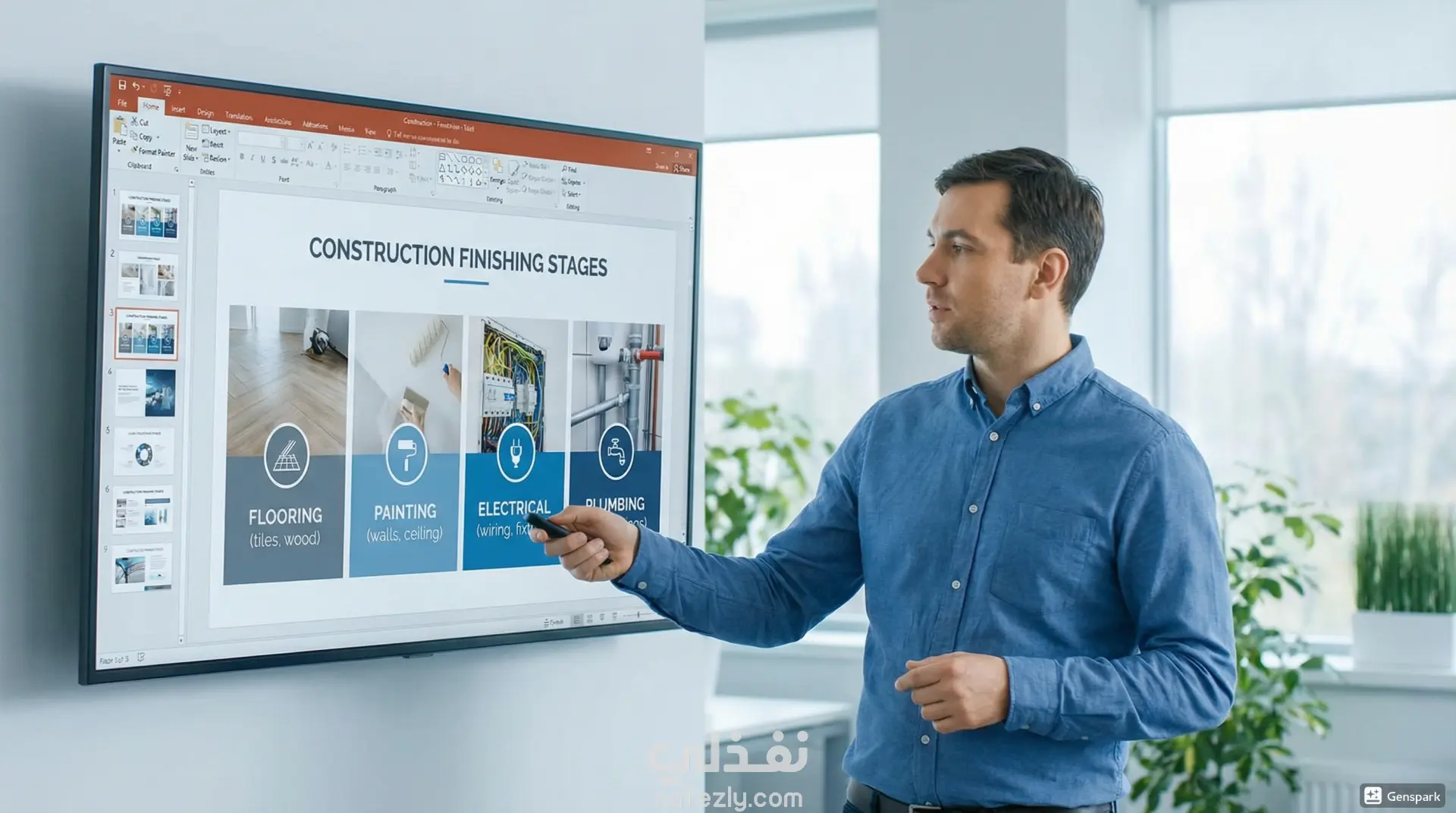 عرض تقديمي هندسي واحترافي لشرح أعمال التشطيب وبنود التنفيذ للعميل