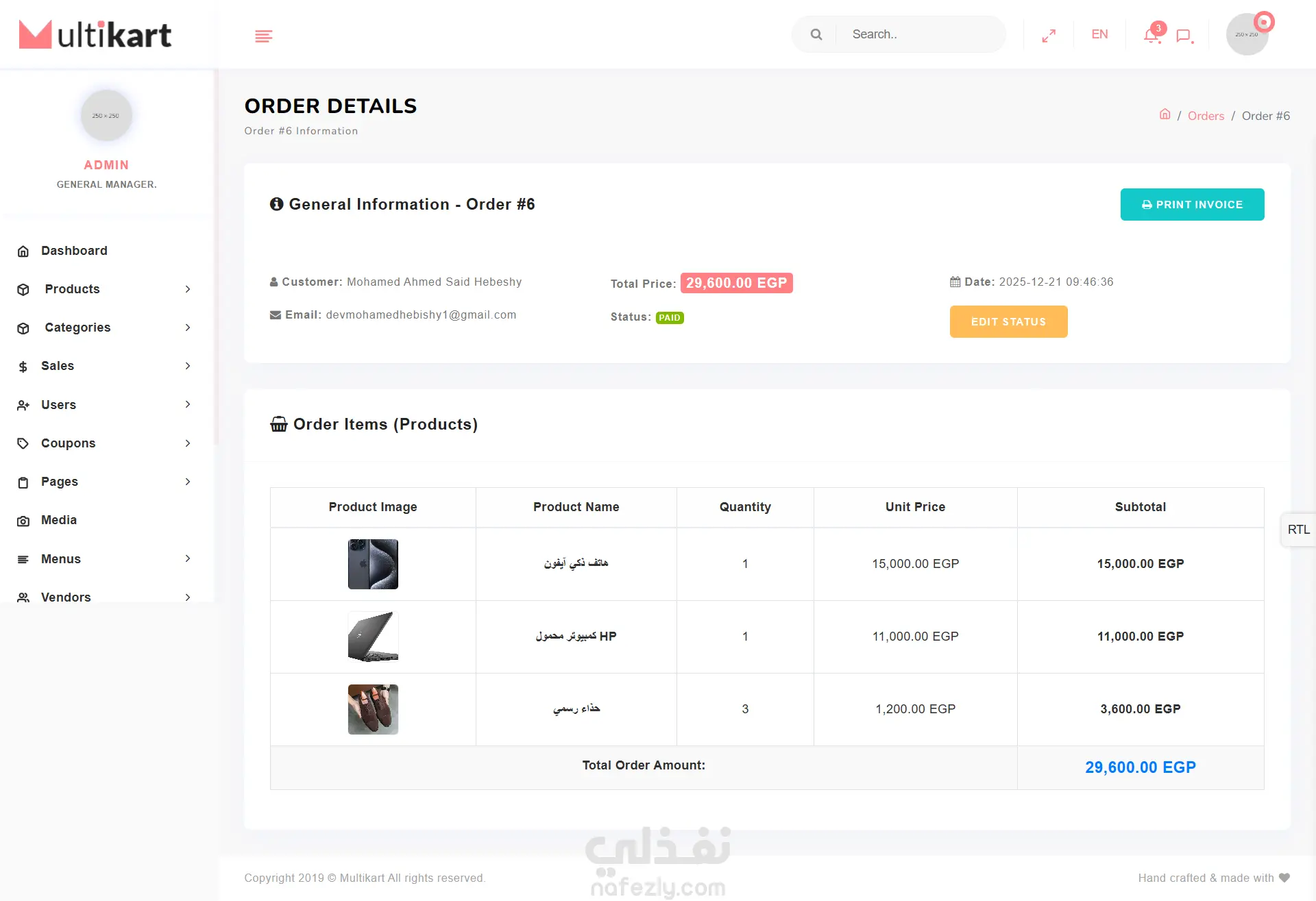هذا المشروع هو منظومة تجارة إلكترونية متكاملة مصممة لتكون "شريكك الرقمي" في النجاح. يوفر النظام رحلة تسوق ممتعة وسلسة للعميل، يقابلها لوحة تحكم إدارية احترافية تمنح المدير سيطرة مطلقة على كل تفاصيل العمل، من إضافة أصغر منتج وحتى طباعة فاتورة البيع.