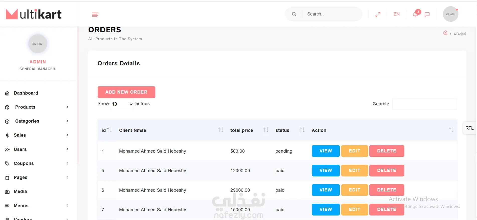 قائمة الطلبات (orders): متابعة جميع عمليات الشراء وحالاتها.
