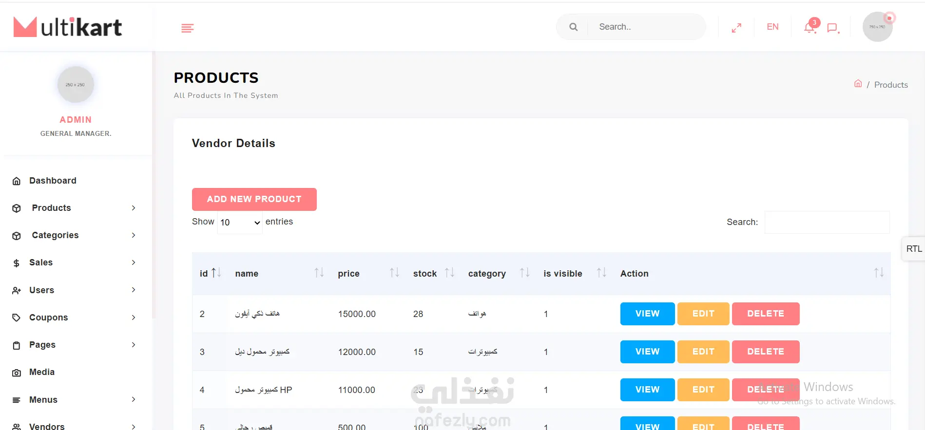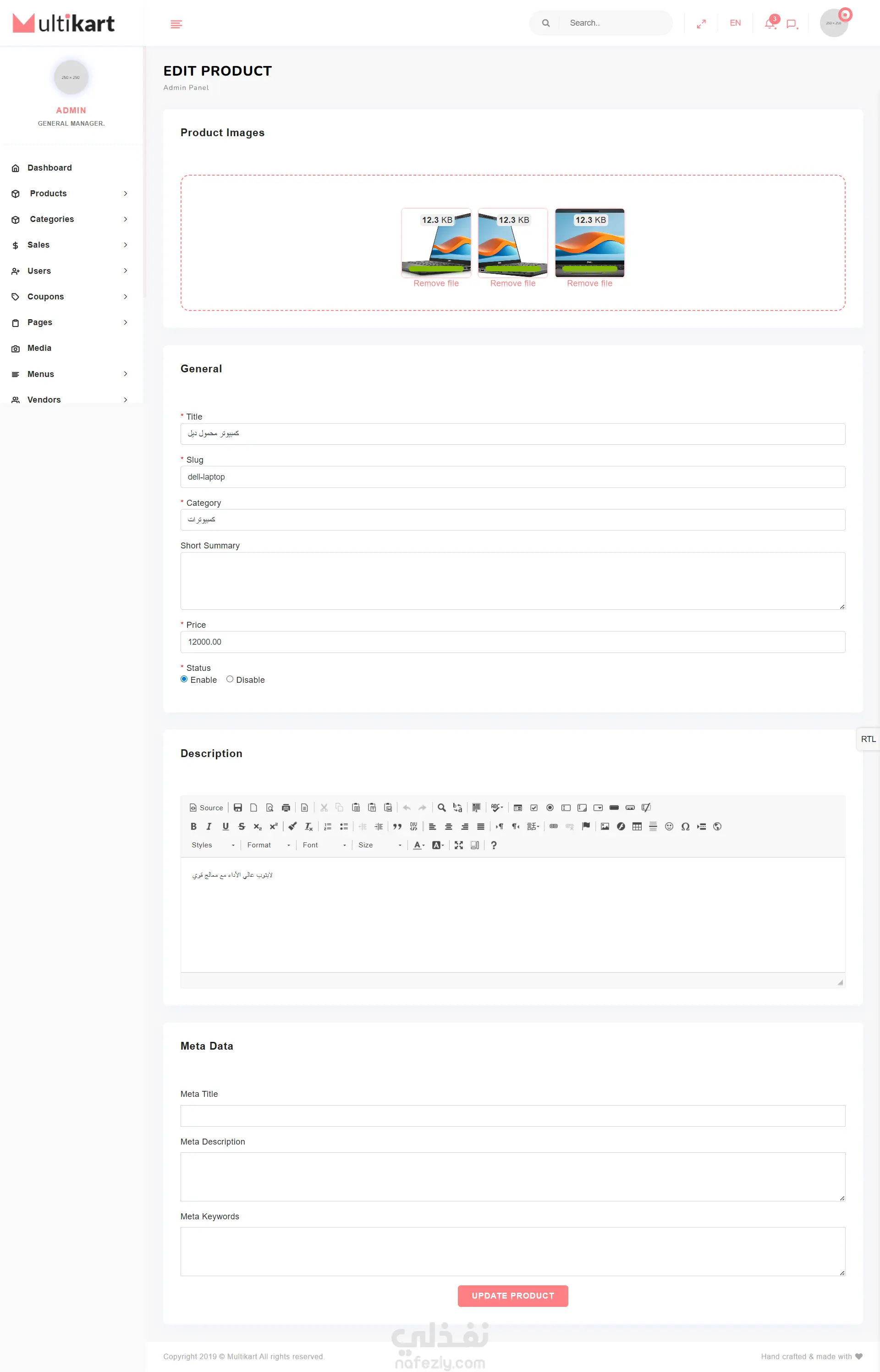 إضافة وتحديث المنتجات (Add/Update Product): نموذج احترافي لإدخال بيانات المنتج، المواصفات، الصور، والتحكم في الأسعار والمخزون.