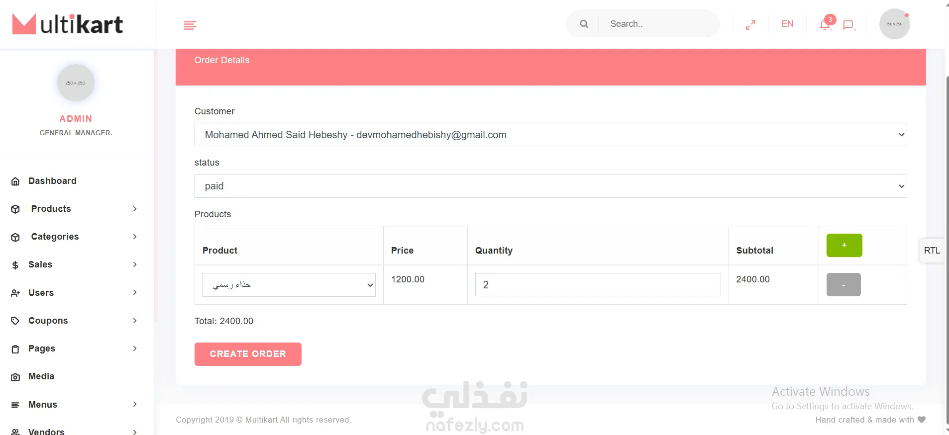 إضافة طلب يدوي (addOrder): إمكانية تسجيل طلبات للعملاء مباشرة من لوحة التحكم.