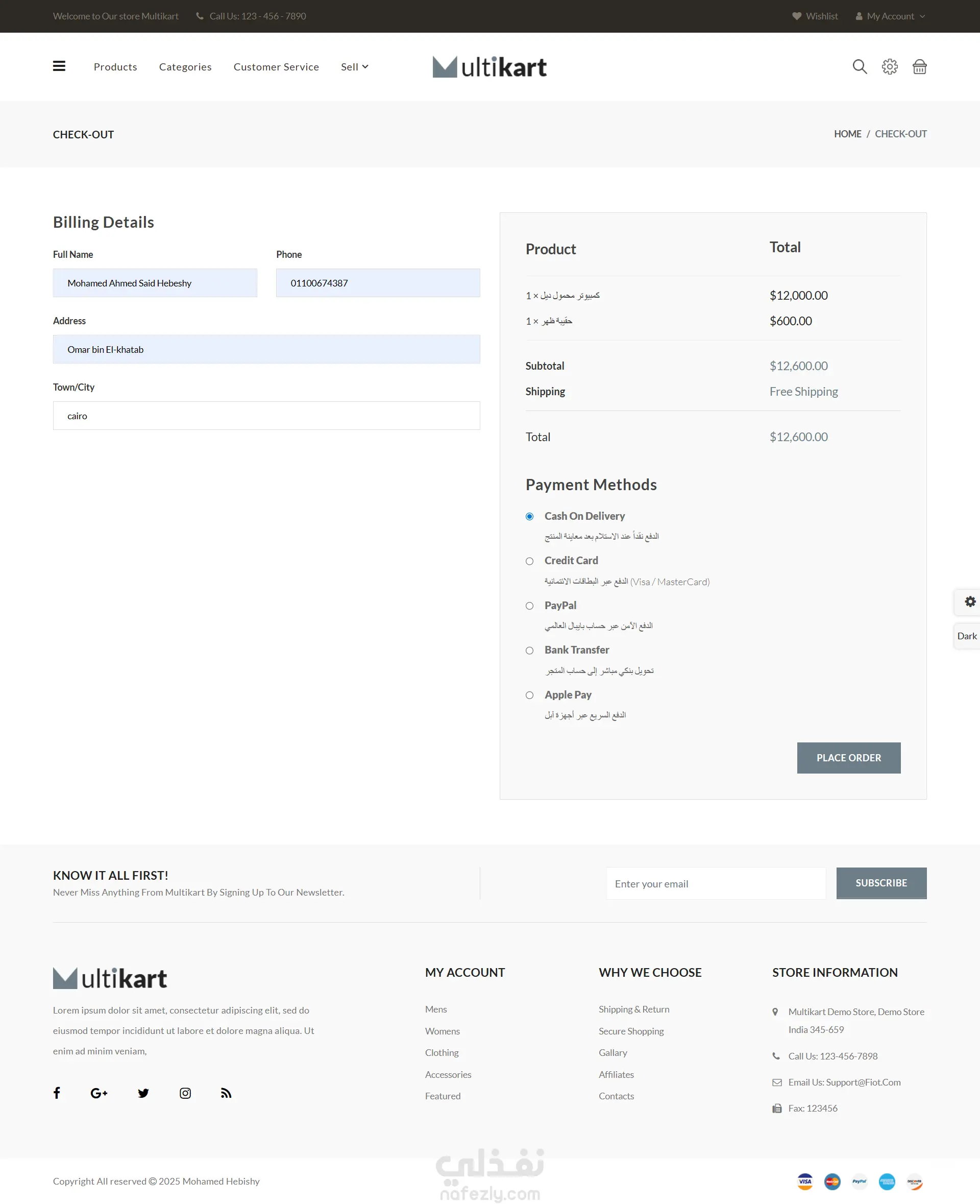 صفحة إتمام الشراء (checkOut): صفحة آمنة ومنظمة لجمع بيانات الشحن واختيار وسيلة الدفع المناسبة.