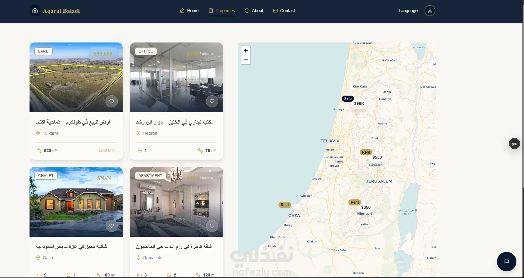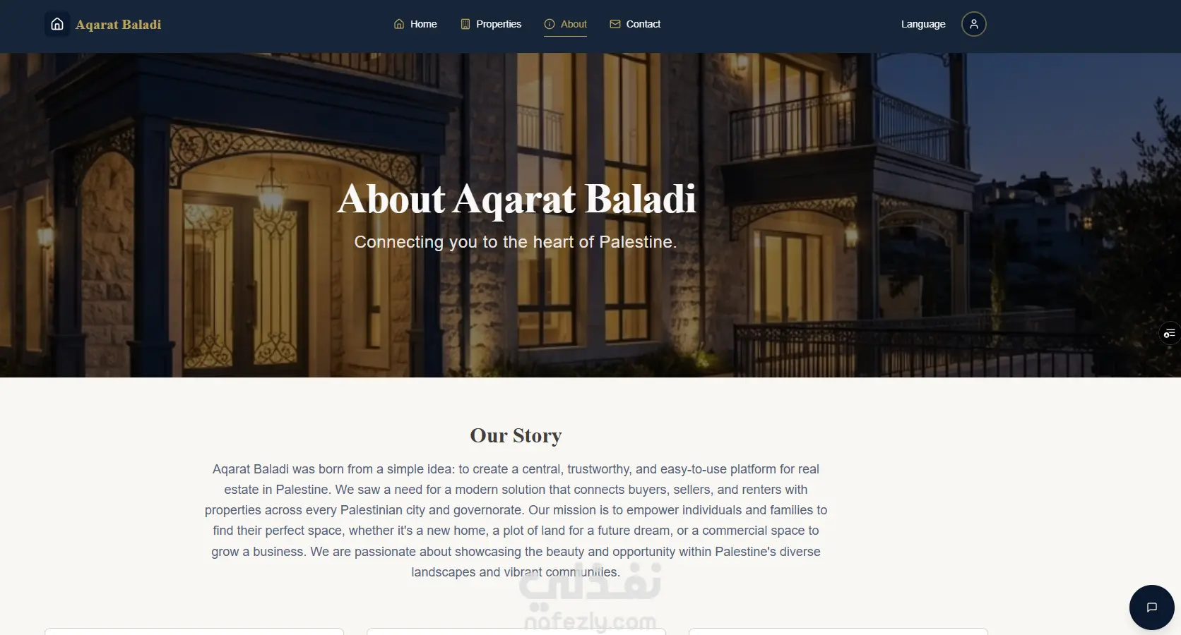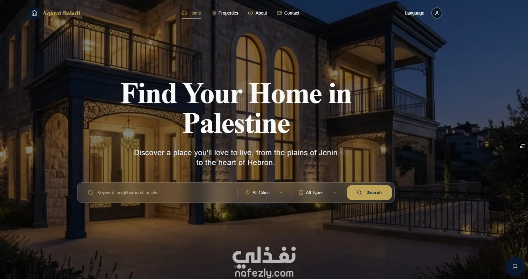 منصة رقمية حديثة متخصصة في عرض وبيع وتأجير العقارات داخل فلسطين، تهدف إلى تسهيل الربط بين البائعين والمشترين والمستأجرين من خلال تجربة استخدام بسيطة، تصميم عصري، وميزات متقدمة تخدم جميع الأطراف.