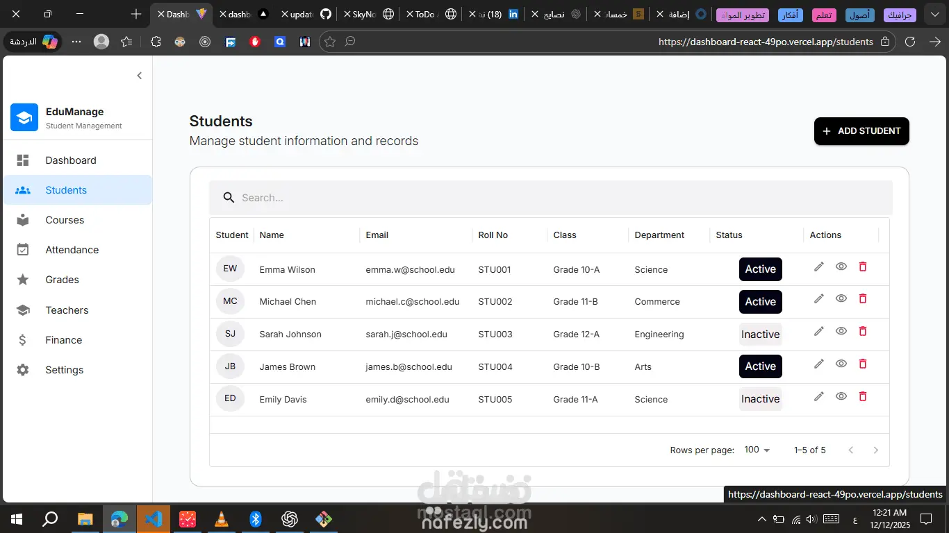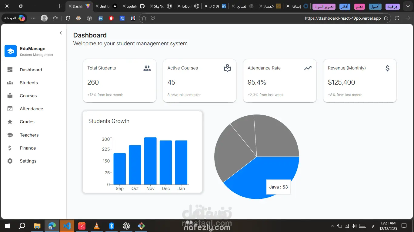 مشروع قيد التطوير Front-End Dashboard Project (React JS) المشروع: لوحة تحكم Dashboard التقنيات المستخدمة: React JS HTML / CSS / JavaScript MUI Components (DataGrid, Buttons, Modals, Dialogs) وصف المشروع: تم تصميم وتطوير لوحة تحكم متكاملة لإدارة بيانات الطلاب، الأقسام، الحضور والدرجات، مع واجهة مستخدم سلسة وسهلة الاستخدام. المشروع يتيح إضافة وتعديل وحذف البيانات بطريقة منظمة مع الحفاظ على تجربة المستخدم. المميزات الرئيسية التي قمت بتطويرها: عرض بيانات الطلاب في جدول تفاعلي (DataGrid) مع إمكانية البحث والفرز. إضافة وتعديل وحذف البيانات باستخدام مودالات تظهر البيانات القديمة لتسهيل التعديل. تصميم واجهة مستخدم متجاوبة ومرتبة باستخدام مكونات MUI. تحسين تجربة المستخدم وسرعة التفاعل مع البيانات. كتابة كود نظيف ومنظم يسهل صيانته وتطويره لاحقًا. النتيجة: لوحة تحكم جاهزة للاستخدام الفعلي. تجربة مستخدم سلسة وسريعة. مشروع يظهر مهاراتي في React وتطوير الواجهات التفاعلية.