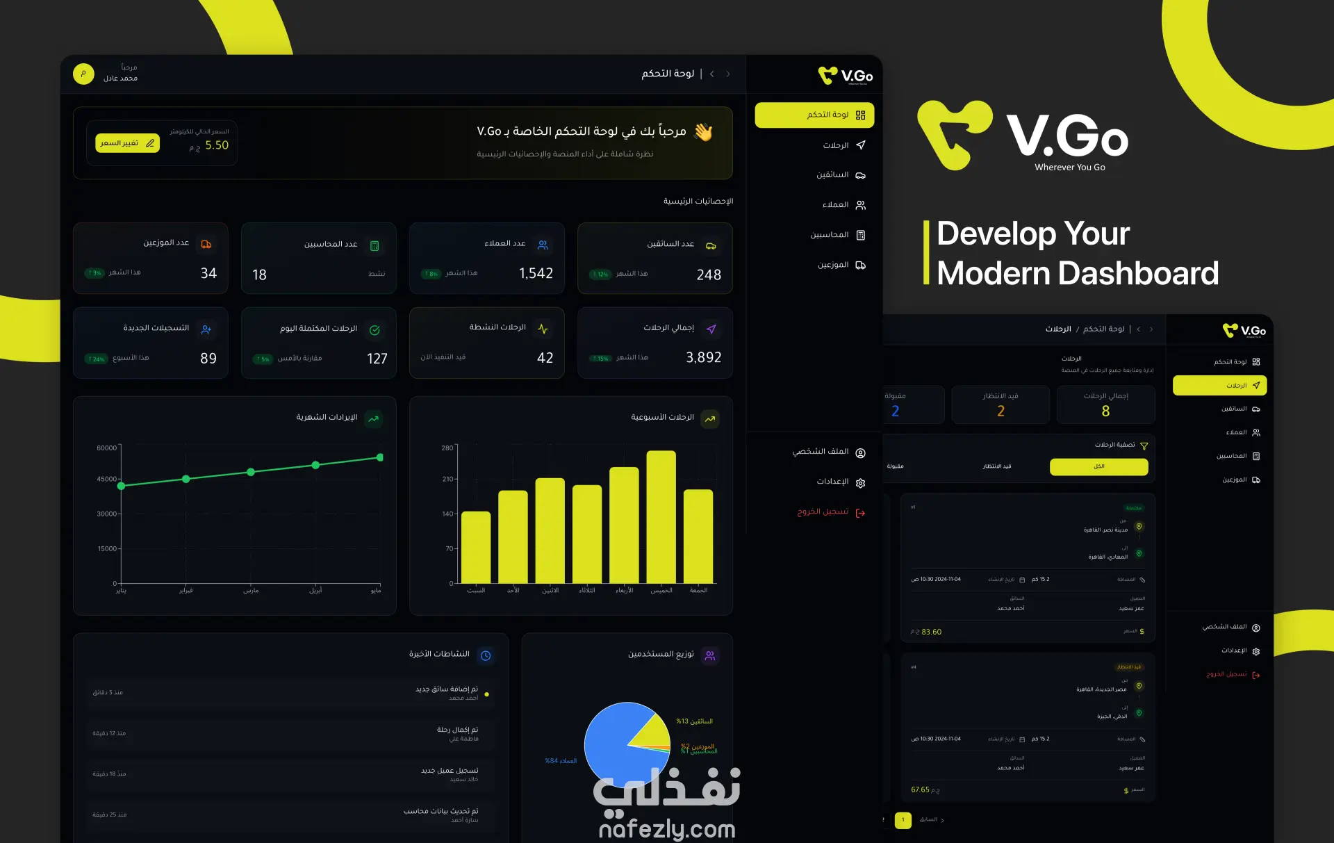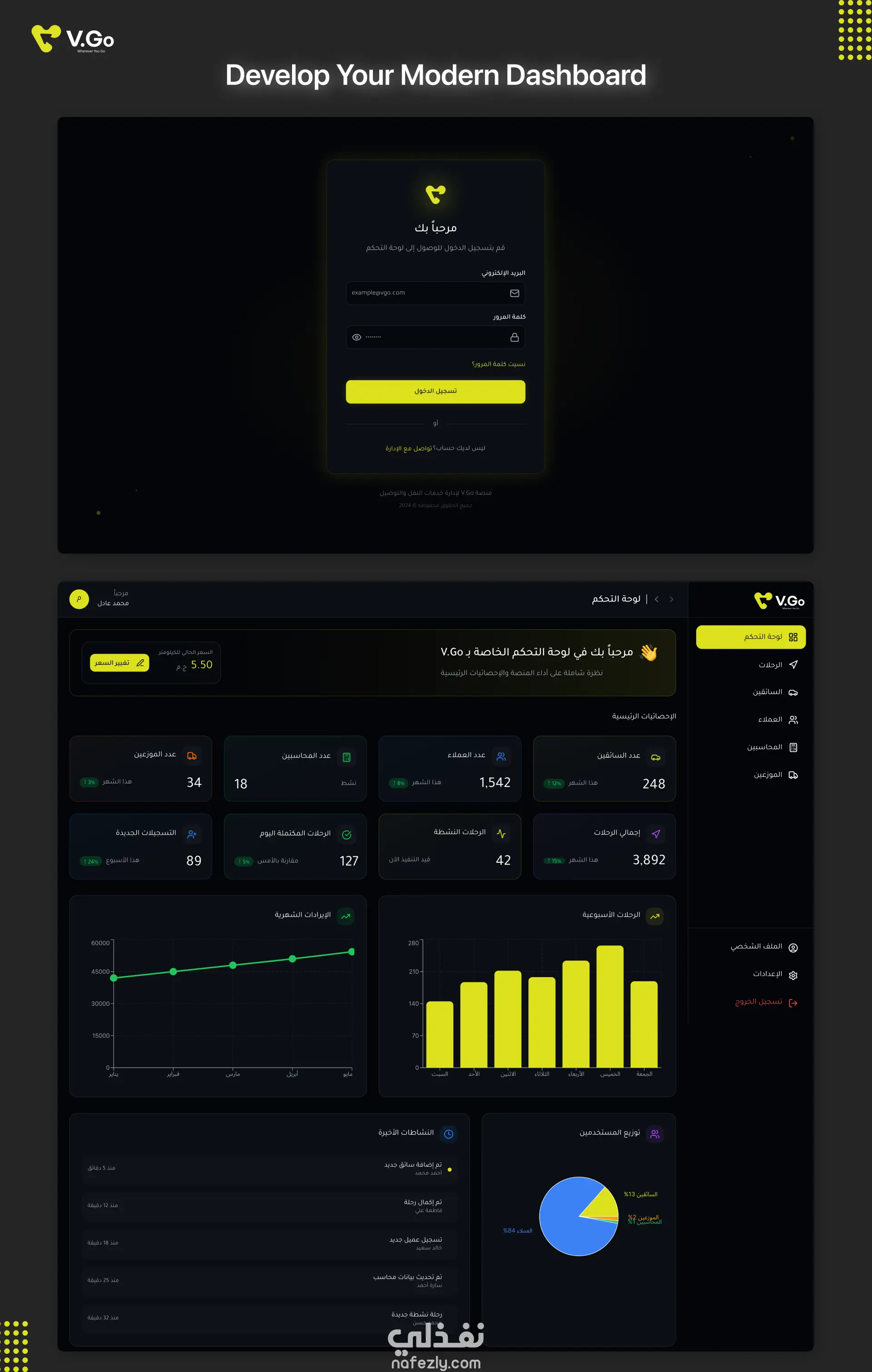 • المدير : إدارة الرحلات، السائقين، العملاء، الإحصائيات، وتسعير الكيلومتر والتحكم الكامل في النظام.