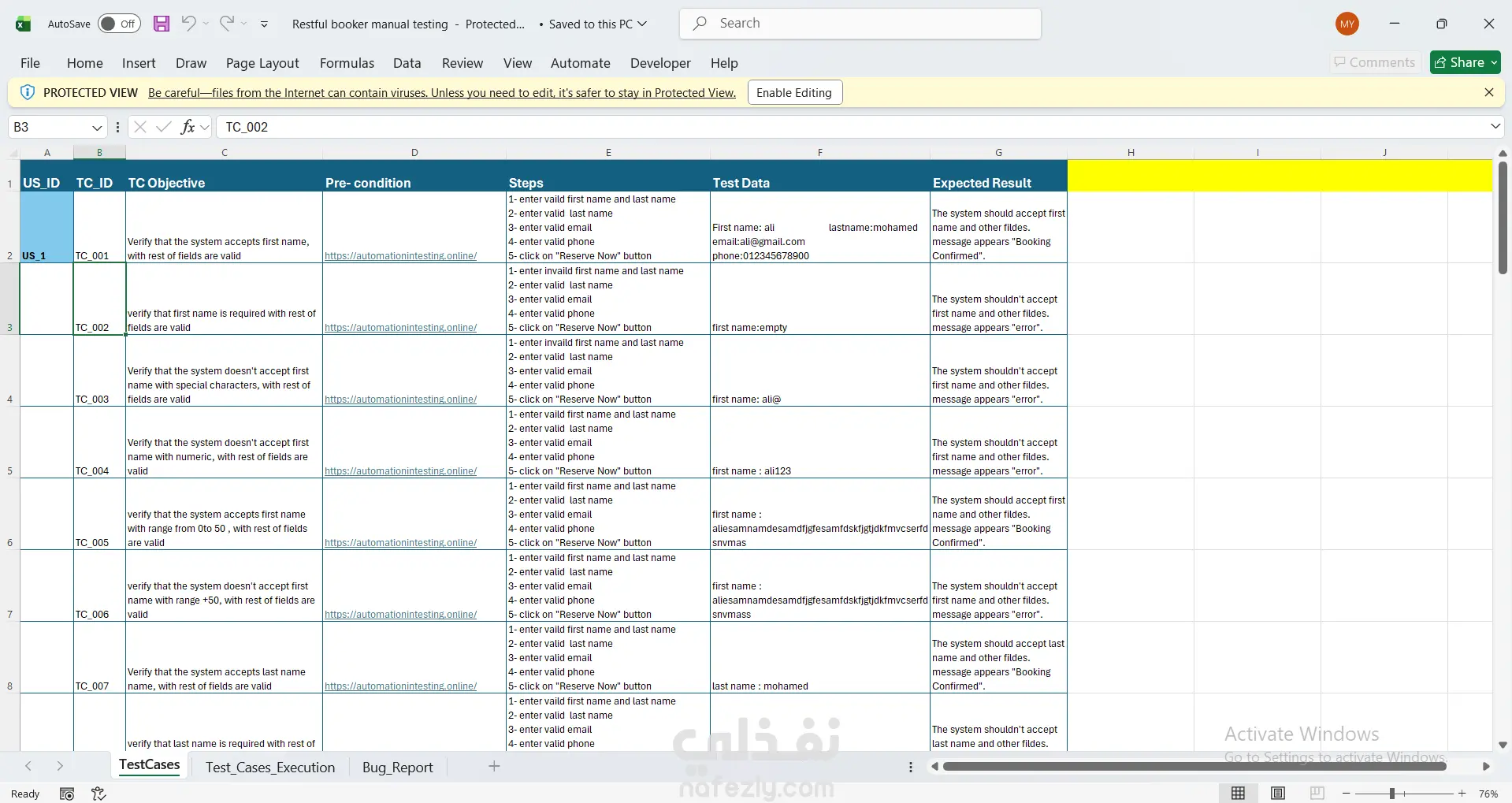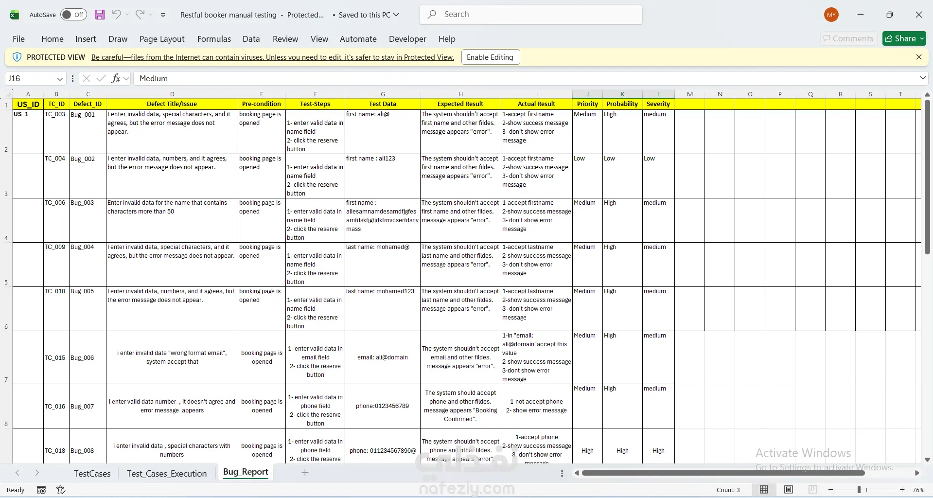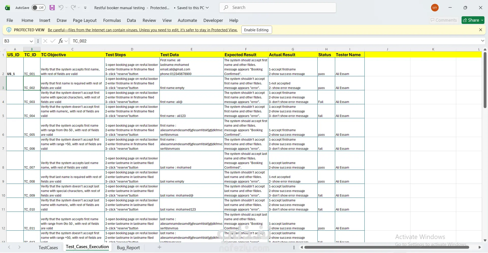 هذا العمل هو جزء من مشروعي في الـ Manual Testing لتطبيق ويب، يوضح طريقة تفكيري في الاختبار، وتنظيم حالات الاختبار، وتوثيق نتائج التنفيذ والأخطاء المكتشفة بشكل احترافي. العمل معروض كنموذج Portfolio لعرض مهاراتي في اختبار البرمجيات يدويًا. 📂 محتويات العمل 1️⃣ Test Cases كتابة حالات اختبار منظمة وواضحة تحديد: Test Objective Preconditions Test Steps Test Data Expected Result تغطية السيناريوهات: حالات طبيعية (Positive) حالات سلبية (Negative) Edge Cases 2️⃣ Test Cases Execution تنفيذ حالات الاختبار فعليًا توثيق: Actual Result Status (Pass / Fail) تتبع الحالات التي فشلت أثناء التنفيذ 3️⃣ Bug Report توثيق الأخطاء المكتشفة بطريقة احترافية كل Bug يحتوي على: Bug ID Description Steps to Reproduce Expected vs Actual Result Priority / Severity تنظيم الأخطاء داخل ملف Excel واضح 🎯 الهدف من العمل إظهار قدرتي على: تحليل متطلبات النظام اكتشاف الأخطاء الوظيفية ومشاكل الاستخدام توثيق نتائج الاختبار بطريقة واضحة تسهّل على فريق التطوير التعامل معها