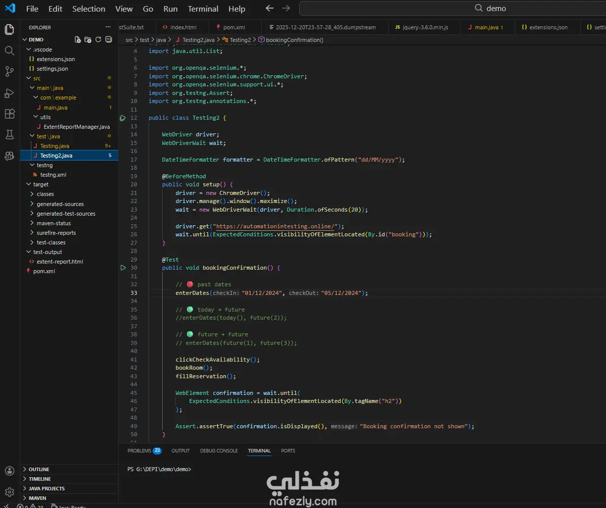 وصف المشروع: هذا المشروع عبارة عن منظومة أتمتة متكاملة لاختبار موقع ويب تم تطويرها باستخدام Selenium WebDriver و TestNG بلغة Java، وتهدف إلى التحقق من جودة وأداء الموقع بشكل آلي ودقيق. تم تصميم المشروع بطريقة احترافية تعتمد على Page Object Model (POM) لضمان سهولة الصيانة، إعادة الاستخدام، وتنظيم الكود. هذا المشروع يعكس خبرتي في أتمتة اختبارات الويب وبناء Framework قابل للتطوير. 🔹 نطاق الاختبارات التي تم تنفيذها ✔ اختبار الصفحة الرئيسية (Home Page) ✔ اختبار صفحات الغرف (Rooms Page) – Single Room – Double Room – Suite ✔ التحقق من: خصائص الغرف (Room Features) السياسات (Policies) ✔ تنفيذ اختبارات الحجز (Booking & Reservation) ✔ اختبار إدخال تواريخ: تواريخ قديمة تاريخ اليوم تواريخ مستقبلية ✔ استخدام Assertions للتحقق من صحة كل خطوة في السيناريوهات 🔹 الهيكل والتصميم (Framework Design) 🔸 Framework منظم باستخدام Page Object Model (POM) 🔸 ترتيب وتنفيذ الاختبارات باستخدام TestNG Priority 🔸 فصل واضح بين: Test Classes Page Classes Utilities 🔸 تقارير اختبار احترافية توضح: حالات النجاح والفشل زمن التنفيذ 🔹 التقنيات والأدوات المستخدمة Java Selenium WebDriver TestNG Maven Page Object Model (POM) XPath & CSS Selectors Assertions 🔹 لماذا هذا المشروع مميز؟ ⭐ ✅ يحاكي سيناريوهات حقيقية لاستخدام المستخدم ✅ مكتوب بأسلوب احترافي قابل للتوسع ✅ مناسب لمشاريع Manual & Automation Testing ✅ يوضح القدرة على بناء Framework متكامل وليس مجرد Test Cases