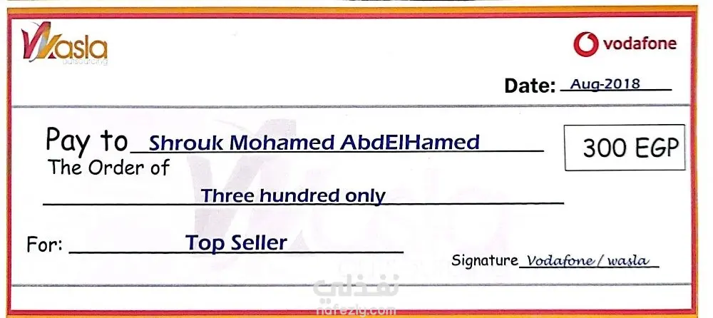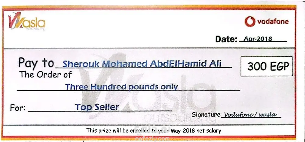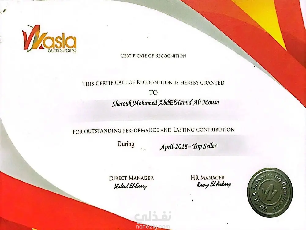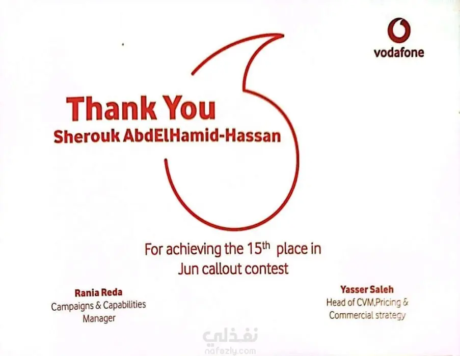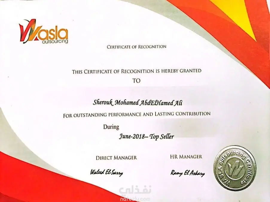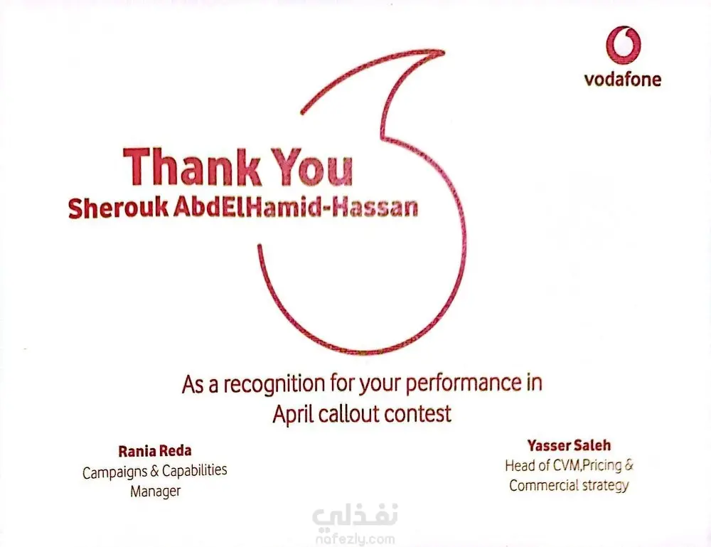 يتلخص العمل في تقديم أداء استثنائي كمسؤول مبيعات في شركة تعهدات (Outsourcing) لصالح شركة فودافون. تضمن الدور الوظيفي: - إجراء المكالمات البيعية الصادرة (Callouts) ضمن مسابقات وحملات مخصصة لرفع القيمة السوقية للعملاء. - تحقيق ورفع مؤشرات الأداء الرئيسية (KPIs) المتعلقة بالمبيعات، مما أدى للتكريم بلقب "الأفضل" والحصول على مكافآت مالية تقديراً للمساهمة الدائمة في نجاح الفريق. - حققتُ أهداف المبيعات الشهرية وتجاوزتها، وجذبتُ عملاء محتملين مؤهلين، وعززتُ علاقات العملاء. - درّبتُ أعضاء الفريق الجدد على استخدام نظام إدارة علاقات العملاء (CRM) والتواصل الفعال. أبرز الإنجازات: حصلتُ على جائزتين ماليتين تقديرًا لأدائي المتميز في المبيعات. حصلتُ على رسالة شكر من شركة (Vodafone) على الأداء في في مسابقة شهر أبريل 2018. حصلتُ على شهادة تقدير من شركة (Wasla) للأداء المتميز والمساهمة الدائمة خلال شهر أبريل كأفضل ممثلة خدمة مبيعات. حصلتُ على شيك بمبلغ 300 جنيه مكافأة مضاف إلى راتب شهر مايو 2018. حصلتُ على رسالة شكر من شركة (Vodafone) على الأداء في في مسابقة شهر يونيو 2018. حصلتُ على شهادة تقدير من شركة (Wasla) للأداء المتميز والمساهمة الدائمة خلال شهر يونيو كأفضل ممثلة خدمة مبيعات. حصلتُ على شيك بمبلغ 300 جنيه مكافأة مضاف إلى راتب شهر أغسطس 2018.