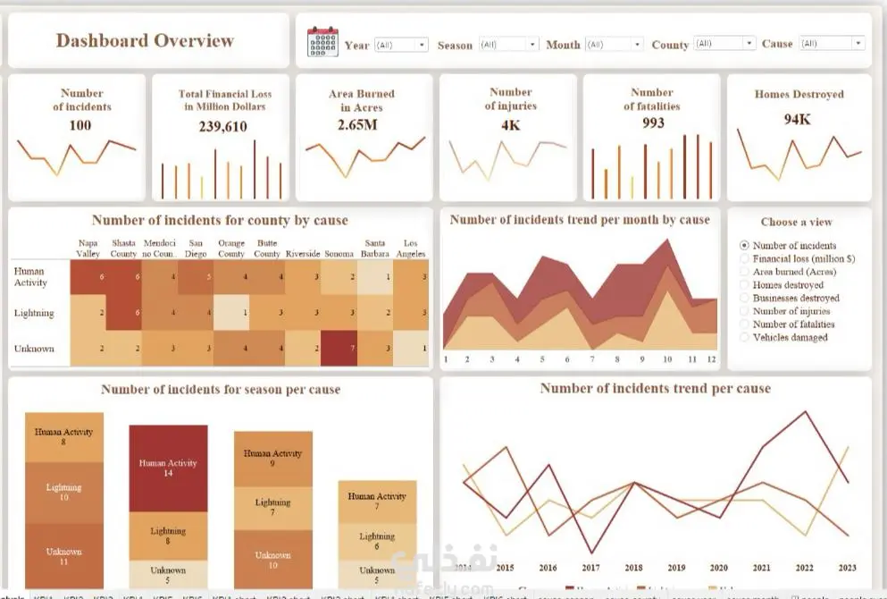 داشبورد تفاعلي يحول 100 حادثة حريق و239.6 مليون دولار خسائر إلى رؤى استراتيجية قابلة للتنفيذ، مع تتبع 94K منزل مدمر و993 حياة مفقودة لفهم الأنماط ومنع الكوارث المستقبلية.