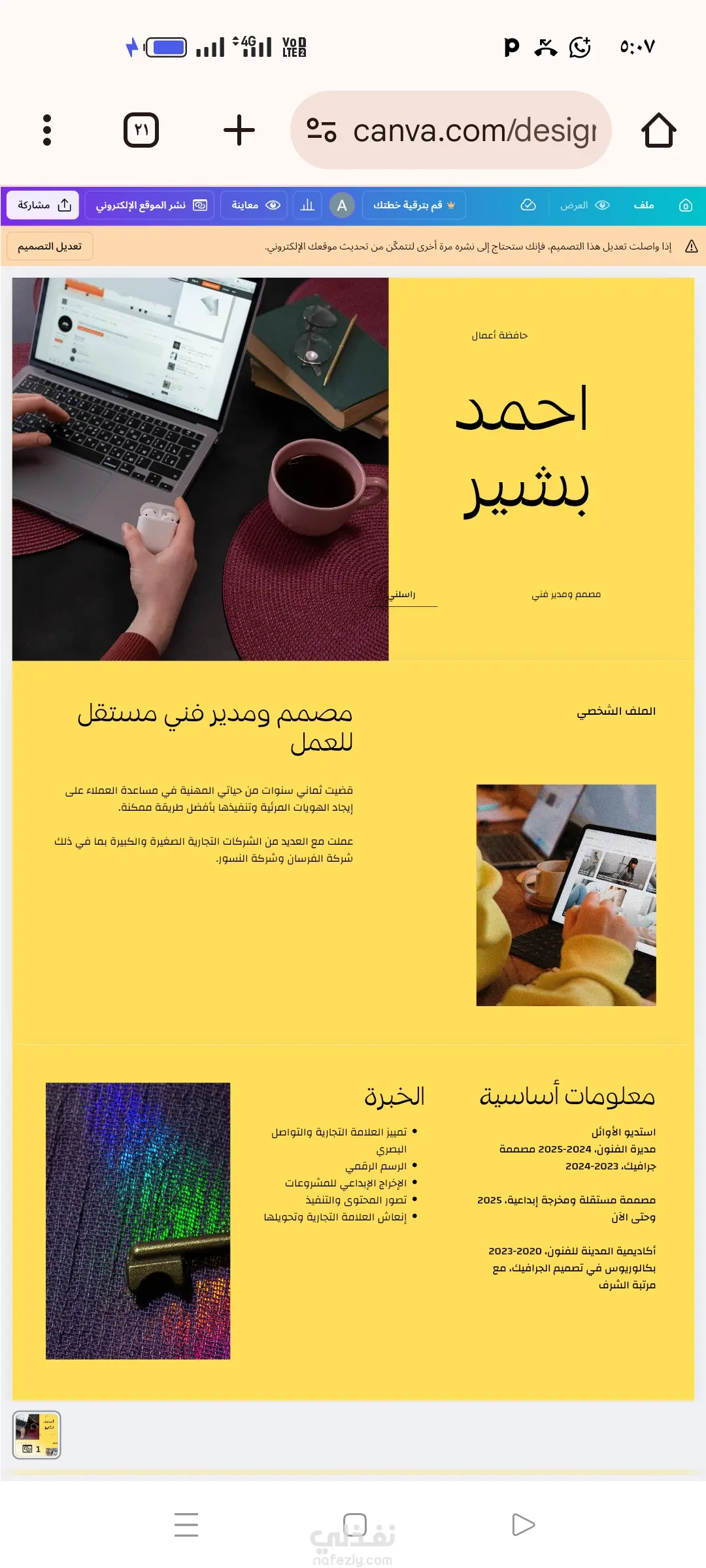 قمت بتنفيذ تصميم واجهة موقع شخصي باستخدام Canva بأسلوب عصري وبسيط يركز على إبراز الهوية الشخصية بشكل واضح واحترافي.