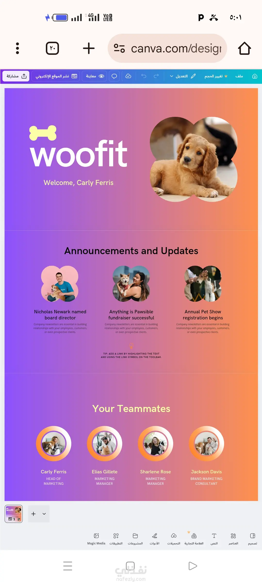 قمت بتنفيذ تصميم واجهة موقع إلكتروني متخصص في بيع الحيوانات الأليفة ومستلزماتها باستخدام Canva، مع التركيز على تقديم تجربة مستخدم جذابة وسهلة تناسب مختلف فئات المستخدمين. يهدف التصميم إلى عرض الحيوانات الأليفة والمنتجات المرتبطة بها بطريقة منظمة وواضحة تشجع الزائر على التصفح واتخاذ قرار الشراء. تم تصميم الواجهة بأسلوب عصري ومريح بصريًا، مع اختيار ألوان مبهجة تتناسب مع طبيعة الموقع، واستخدام أيقونات وصور تعكس عالم الحيوانات الأليفة. كما تم الاهتمام بتنظيم الأقسام الرئيسية مثل: عرض الحيوانات، مستلزمات الحيوانات، العروض الخاصة، معلومات العناية، وصف المنتجات، ووسائل التواصل. راعيت في التصميم سهولة التنقل بين الصفحات، ووضوح أزرار الدعوة إلى الإجراء مثل (شراء الآن – عرض التفاصيل – تواصل معنا)، مع التركيز على تجربة المستخدم (UX) لضمان وصول الزائر إلى ما يبحث عنه بسرعة وسلاسة. التصميم مناسب ليكون نموذجًا أوليًا (UI Design) لمتجر إلكتروني خاص ببيع الحيوانات الأليفة ومستلزماتها، ويمكن تطويره لاحقًا إلى موقع متكامل عبر البرمجة أو منصات التجارة الإلكترونية المختلفة.
