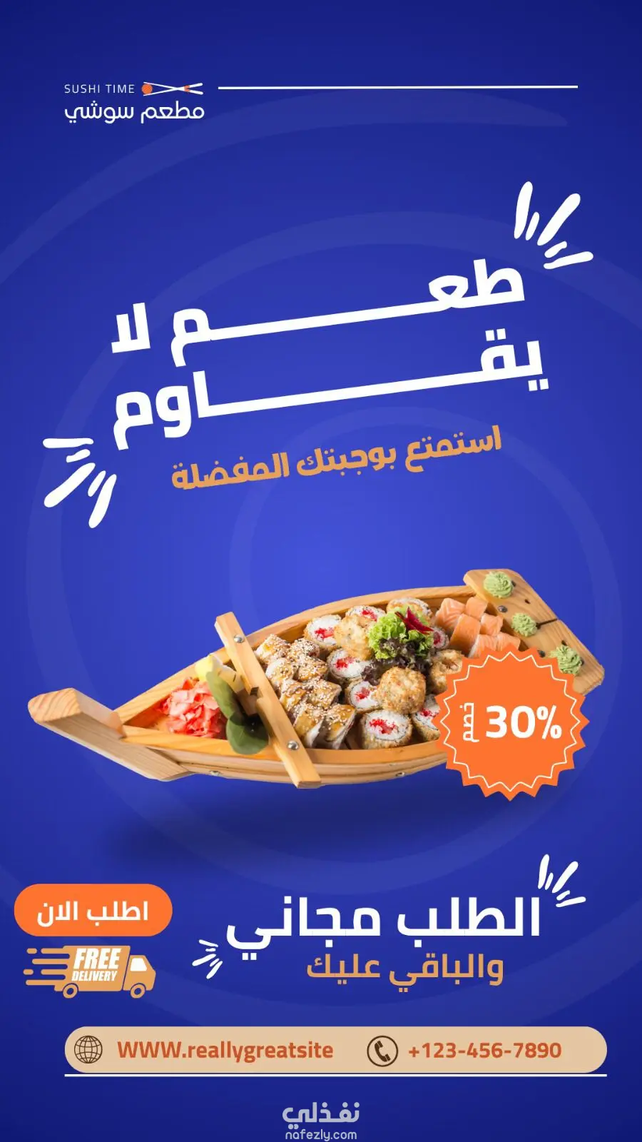 يعتمد التصميم بشكل كامل على اللون الأزرق الملكي للخلفية، وهو اختيار جريء يكسر القاعدة التقليدية لألوان المطاعم (الأحمر والأصفر)، مما يمنح الإعلان طابعاً "فريداً" و "مودرن" ويجعل ألوان السوشي الطبيعية والبرتقالية تبرز بقوة. توسط التصميم قارب سوشي خشبي متنوع، تم إخراجه بطريقة "الظل الساقط" ليعطي إيحاءً بأنه يطفو في الفراغ، مما يضيف لمسة فنية جذابة.