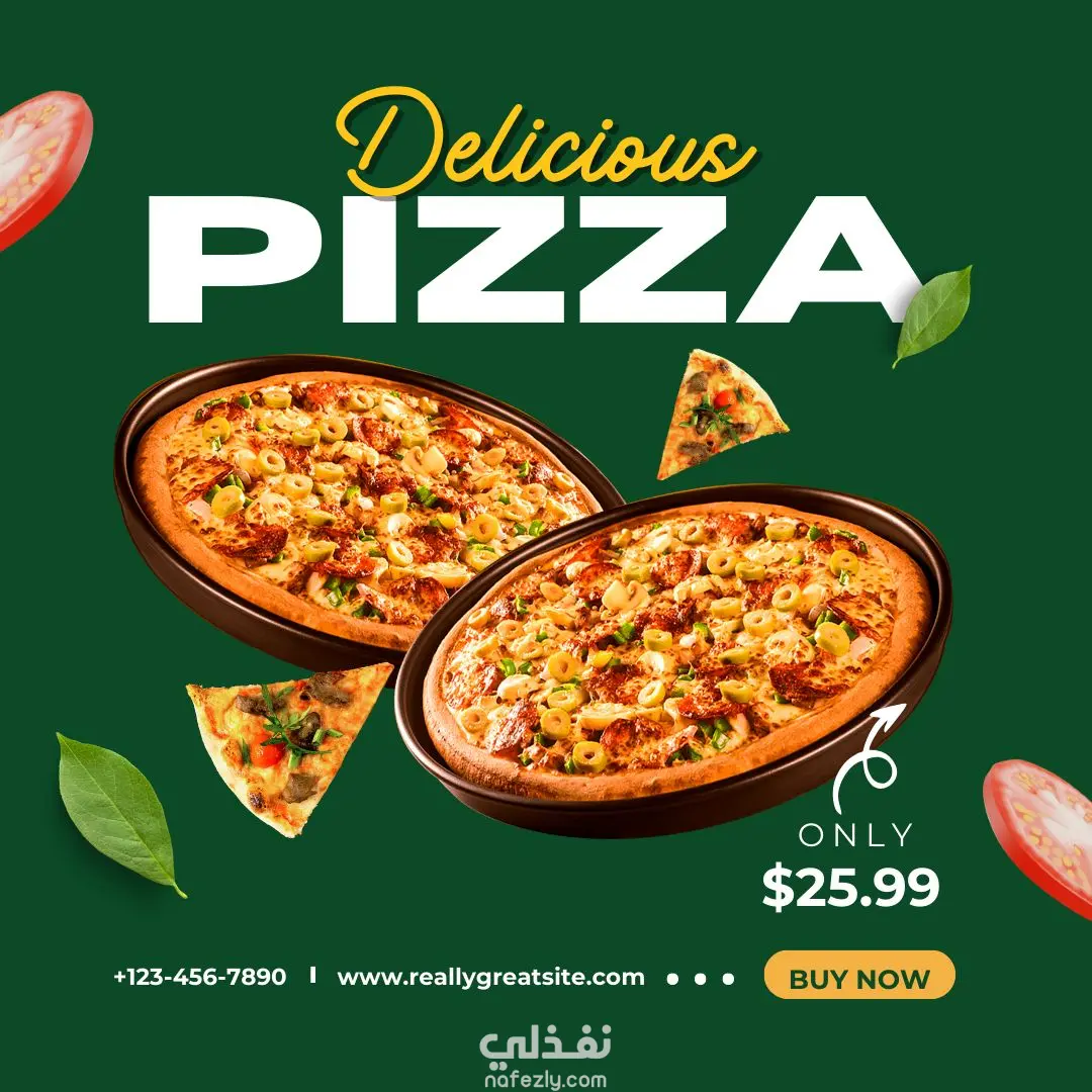 التكوين الديناميكي (Dynamic Composition): تعتمد في تصاميمك (خاصة البيتزا والجمبري) على توزيع العناصر بشكل يوحي بالحركة "Floating Elements"، مثل قطع الطماطم وأوراق الريحان المتطايرة، مما يمنح الإعلان حيوية تجذب العين فوراً. تُجيد اختيار الخلفيات التي تُبرز المنتج؛ فاستخدام الأخضر الداكن مع البيتزا يُعزز الإيحاء بالطزاجة والمكونات العضوية، بينما استخدام الأزرق الملكي مع السوشي يمنح شعوراً بالفخامة والتميز.