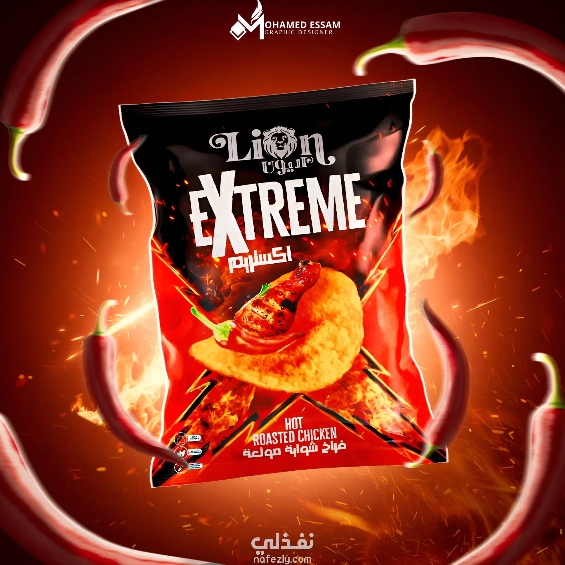 تصميم إعلان قوي يعكس الطابع الحار والجريء لمنتج Lion Extreme، باستخدام عناصر النار والفلفل الحار لإيصال إحساس القوة والطعم الحاد. تم التركيز على إبراز العبوة بشكل لافت مع مؤثرات بصرية تعزز تجربة المشاهد وتدعم هوية المنتج الجريئة.
