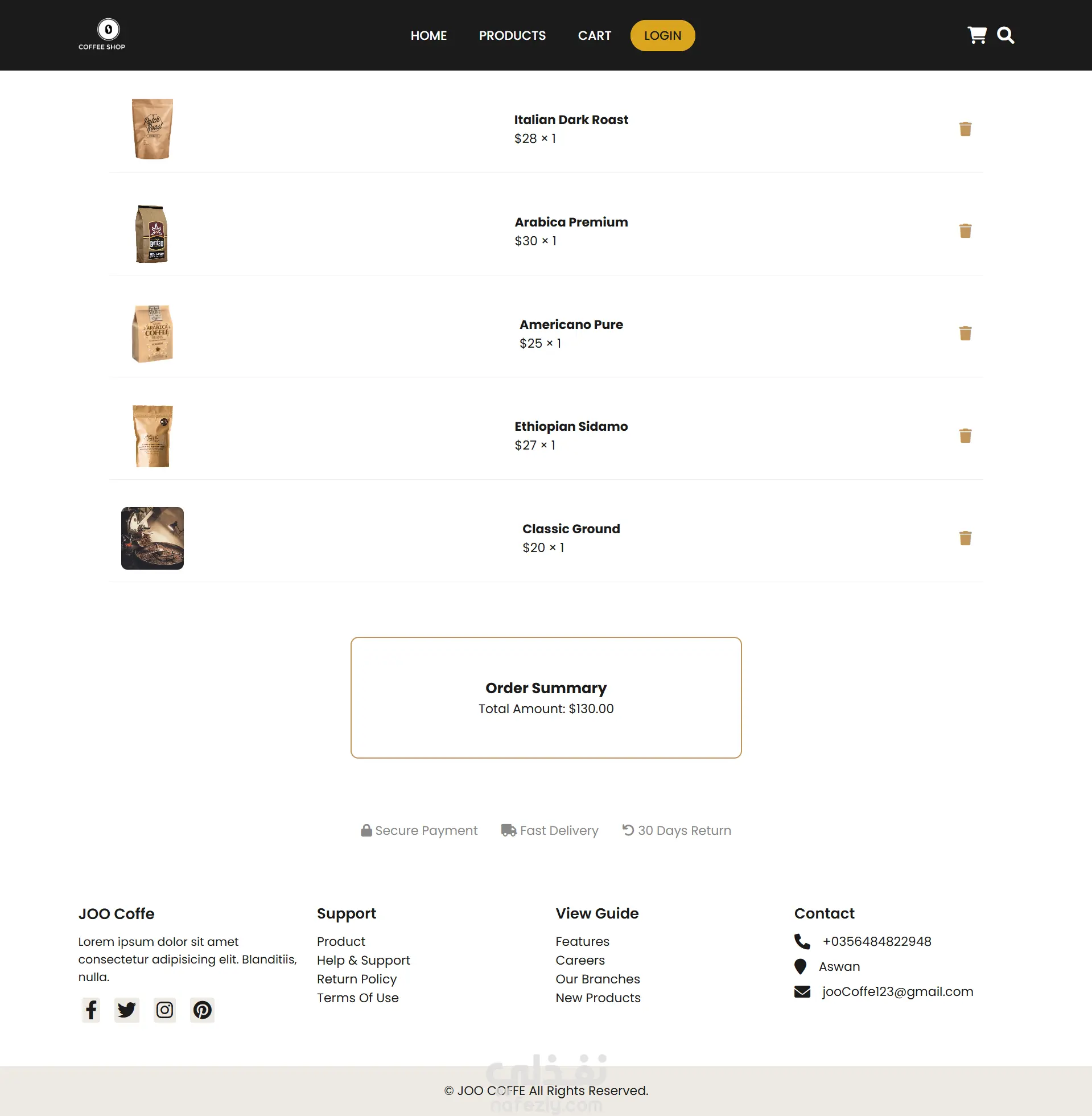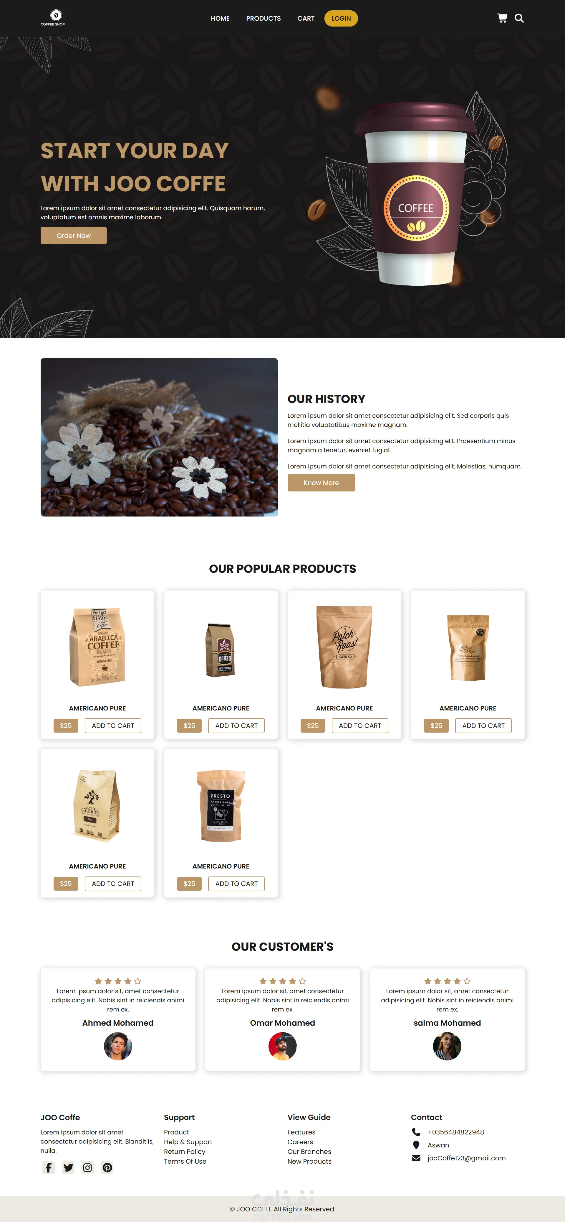 قمت بتطوير موقع ويب لبيع القهوة عبر الإنترنت يتيح للمستخدمين تصفح المنتجات وإدارة سلة المشتريات بسهولة.