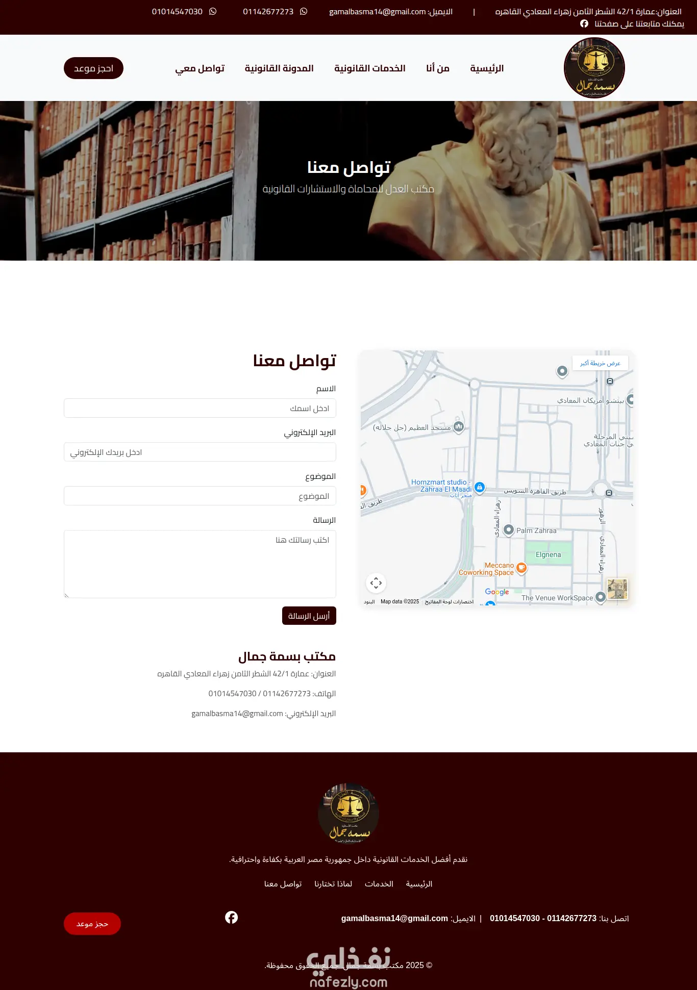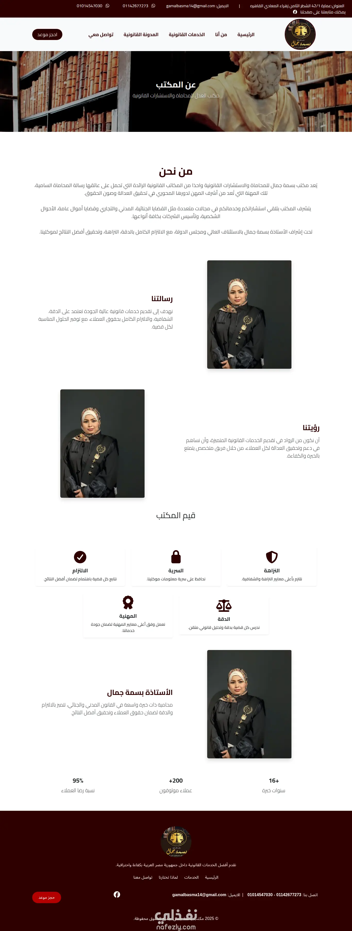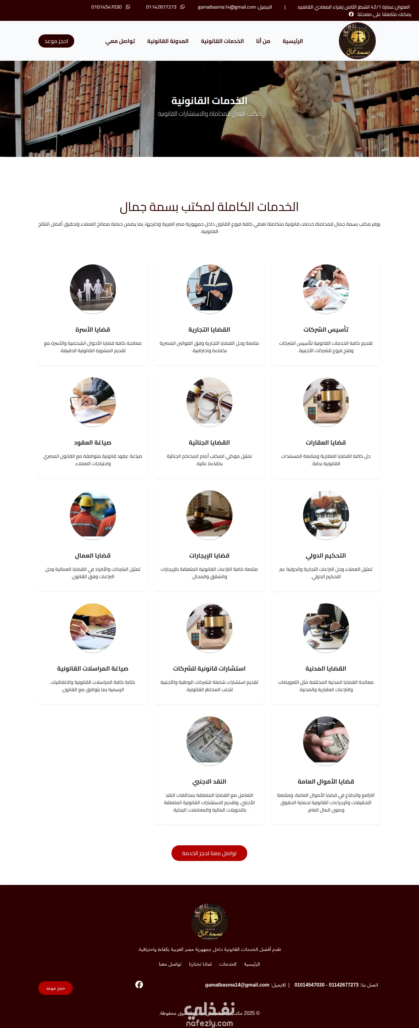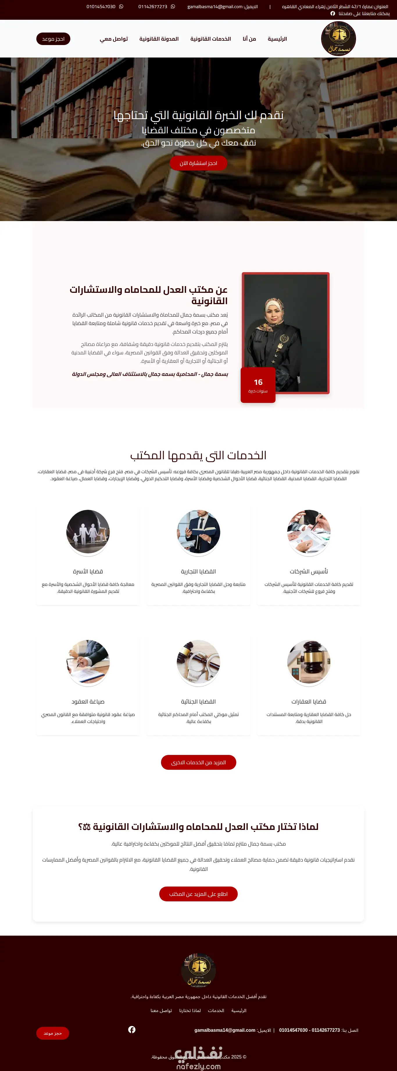 صفحات رئيسية تعرض الخدمات القانونية، نبذة عن المحامية، وآليات التواصل مع العملاء.