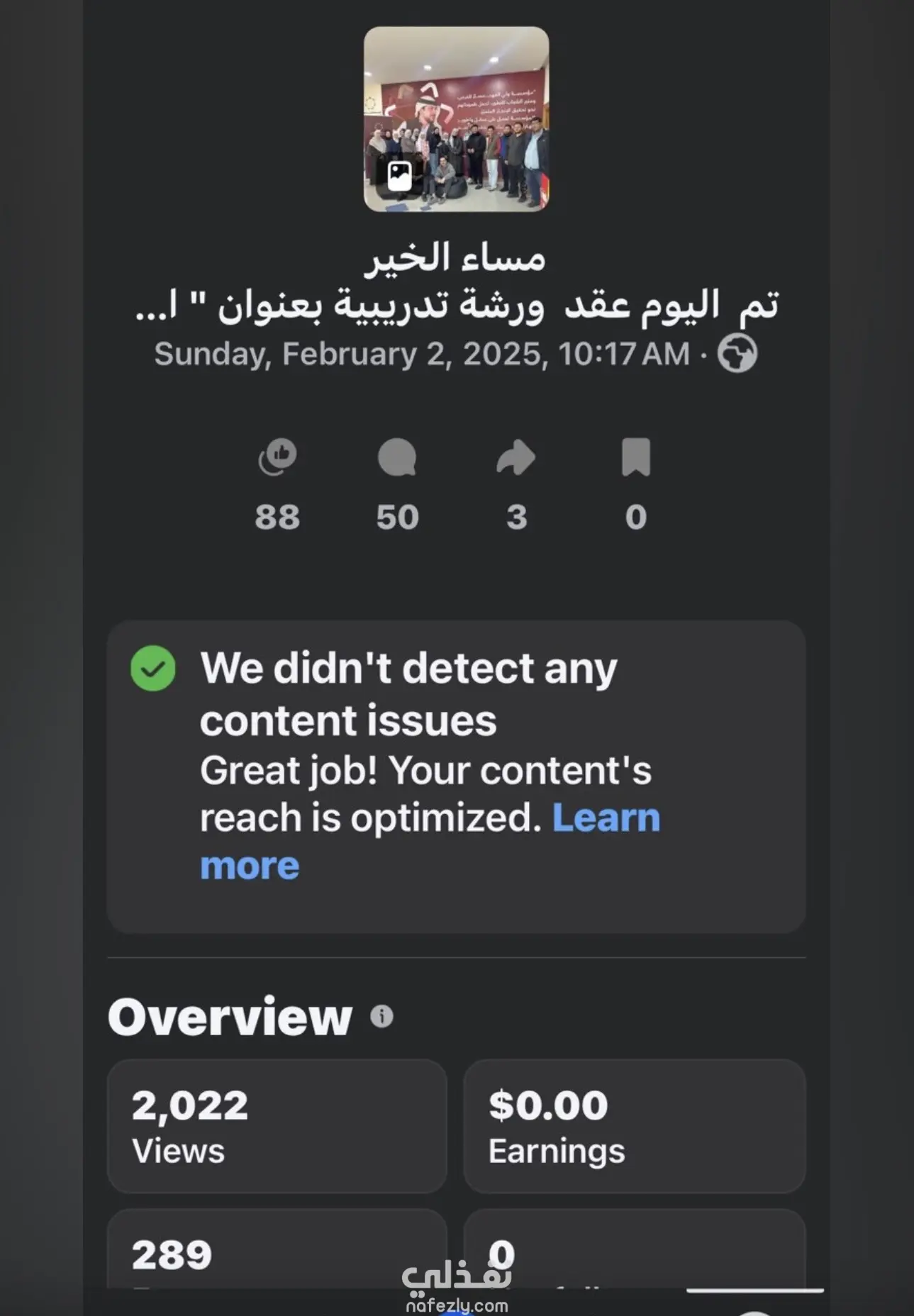 تحليل أداء منشور على منصة فيسبوك باستخدام أدوات التحليل (Post Insights) حيث تم تقييم عدد المشاهدات، التفاعل (الإعجابات، التعليقات، المشاركات)، ومدى وصول المحتوى للجمهور المستهدف. أظهرت النتائج تفاعلًا جيدًا ووصولًا مناسبًا، مع تأكيد من المنصة أن المحتوى متوافق ومحسّن للانتشار، مما يساعد على تحسين استراتيجية المحتوى مستقبلاً.