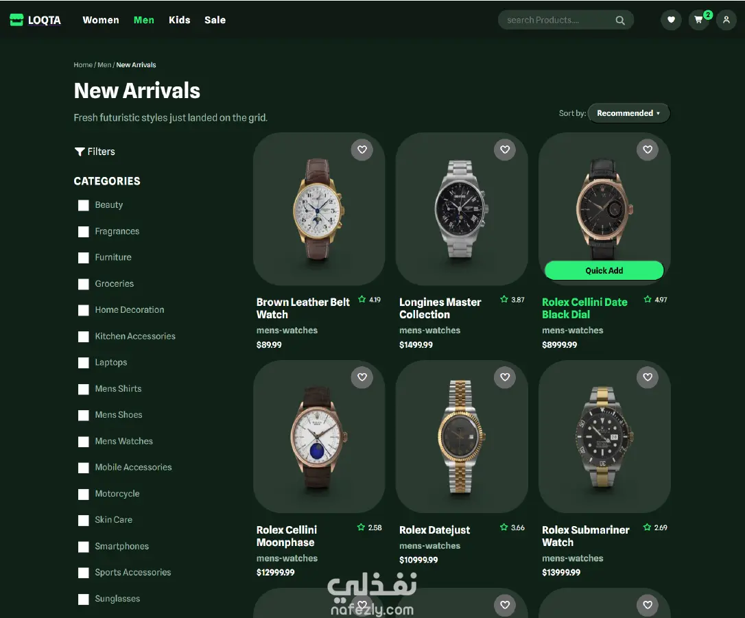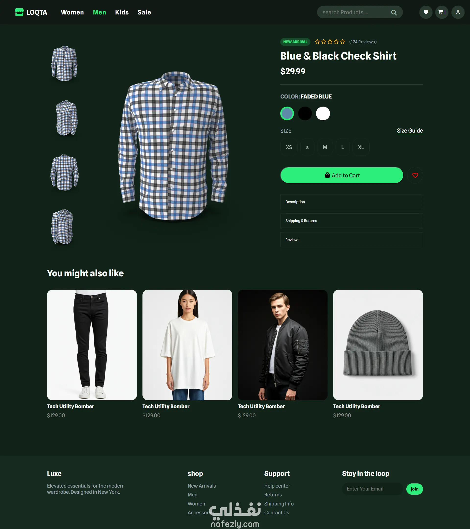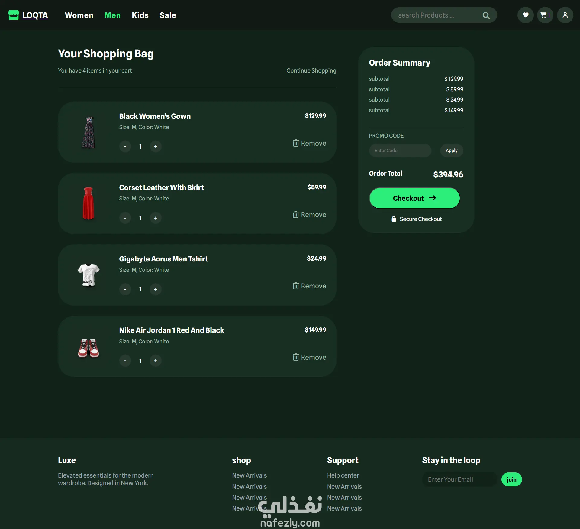 تطبيق ويب لمتجر إلكتروني متخصص في الملابس والإكسسوارات، يركز على تقديم واجهة مستخدم (UI) عصرية بنظام الـ Dark Mode. المشروع يغطي كافة مراحل رحلة العميل؛ من تصفح المنتجات، الفلترة حسب الفئة، وحتى إدارة سلة التسوق وإتمام عملية الطلب.