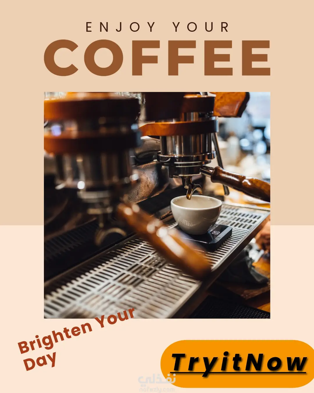 تصميم إعلان جذاب ومُلفت لعشاق القهوة، يُبرز لحظة تحضيرها بطريقة أنيقة ومفعمة بالحيوية. مناسب للحملات التسويقية على السوشيال ميديا أو الطباعة. يحتوي على عناصر بصرية قوية مثل عبارة "استمتع بقهوتك" ونداء واضح للتجربة "جرّبها الآن". التصميم جاهز بجودة عالية ويمكن تعديله حسب الطلب