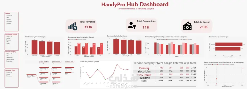 تم تنفيذ Dashboard تفاعلي باستخدام Power BI لتحليل أداء الخدمات والحملات التسويقية لمنصة HandyPro Hub، بهدف دعم متخذي القرار من خلال تتبع الإيرادات، التحويلات، والإنفاق الإعلاني، مع ربط النتائج بعوامل مختلفة مثل الموسم، نوع العميل، قناة التسويق، وفئة الخدمة.