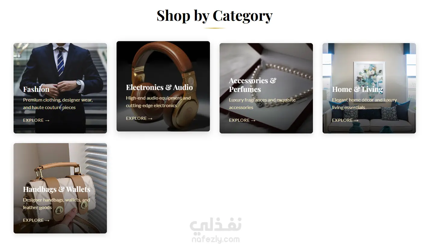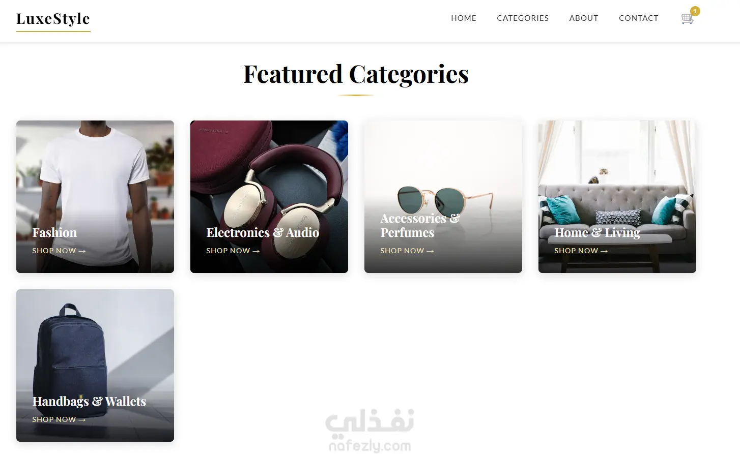 - واجهة متعددة الصفحات بتصميم Premium (Home – Categories – About – Contact – Cart).