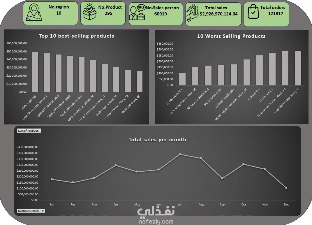 تصميم لوحة بيانات تنفيذية (Executive Dashboard) لعرض ملخص سريع ومباشر لأداء المبيعات. تجيب هذه الداشبورد على أهم الأسئلة: ما هي المنتجات الأكثر ربحية والأقل ربحية؟ وكيف هو أداء المبيعات على مدار السنة؟ كما تعرض مؤشرات الأداء الرئيسية (KPIs) بوضوح لمساعدة الإدارة العليا على متابعة أداء الشركة واتخاذ قرارات سريعة ومبنية على البيانات.