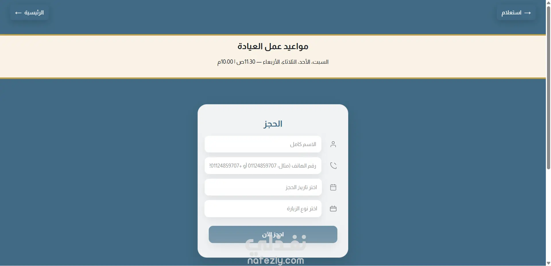 موقع حجز احترافي يجعل تجربة المريض أكثر سهولة ومرونة، ويساعد العيادة على تنظيم العمل اليومي بكفاءة عالية واحترافية.