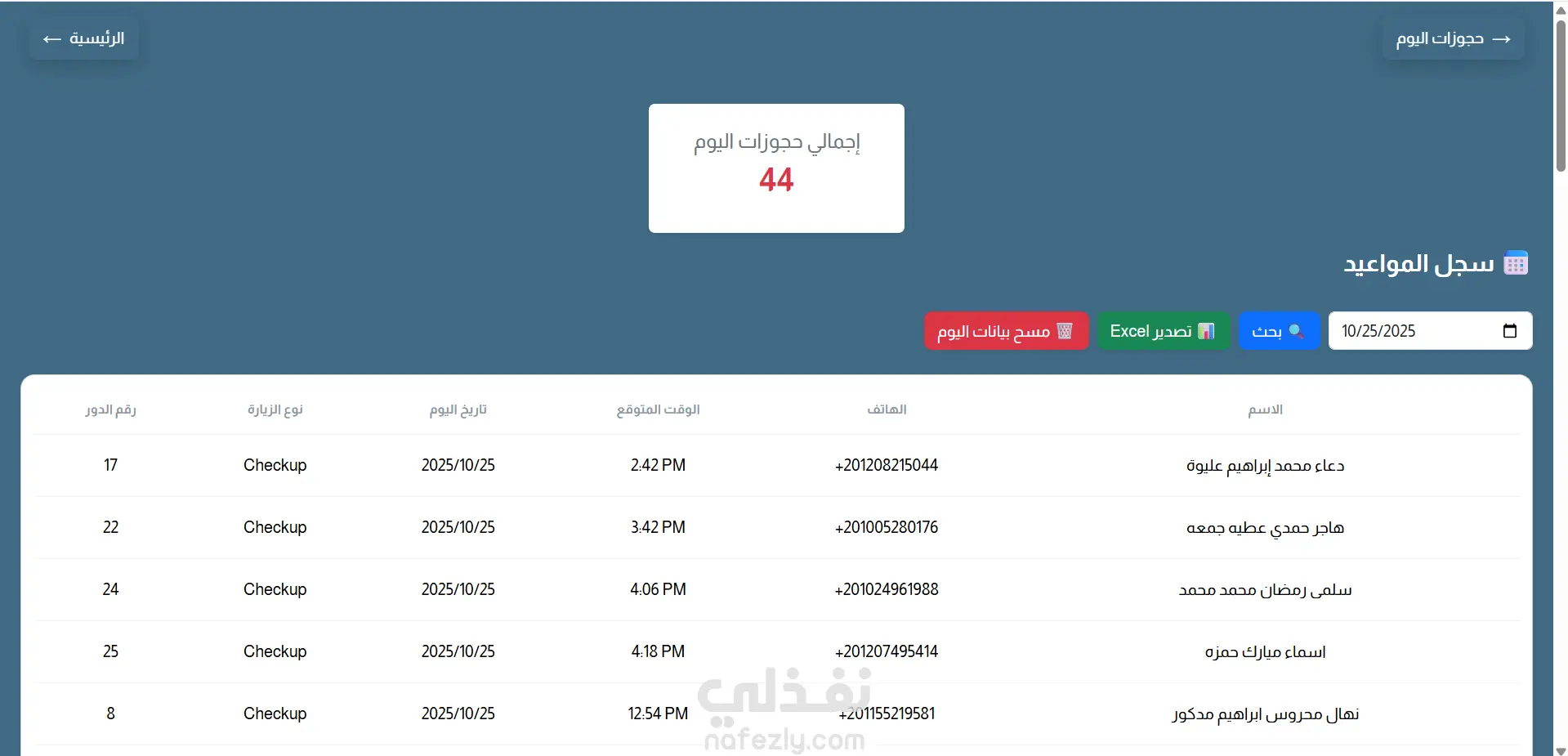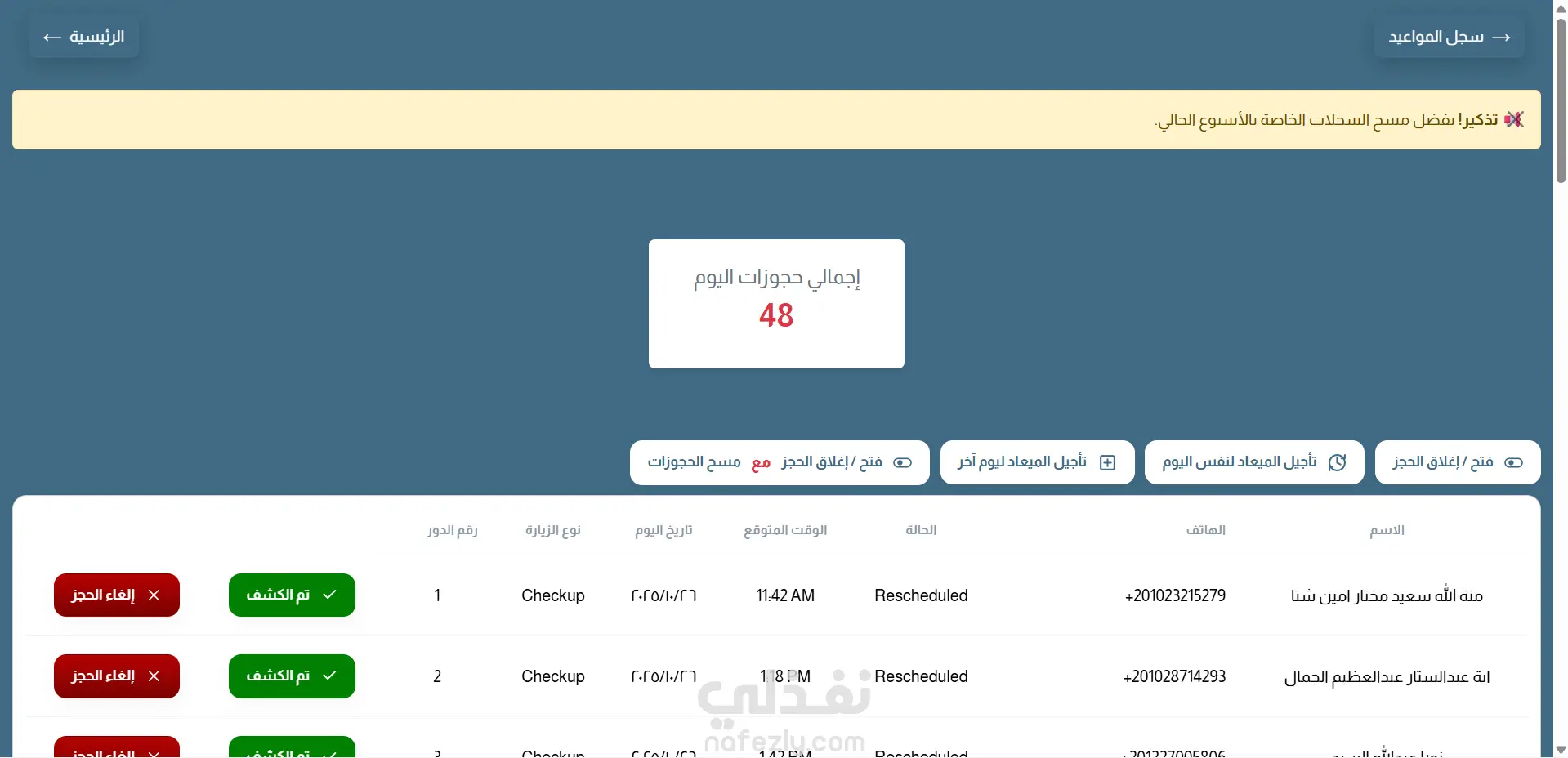 لوحة تحكم متكاملة: عرض المواعيد اليومية والأسبوعية، تحديث حالة الحجز (تم الكشف / إلغاء)، وإمكانية إغلاق الحجز مؤقتًا أو كليًا حسب الحاجة.