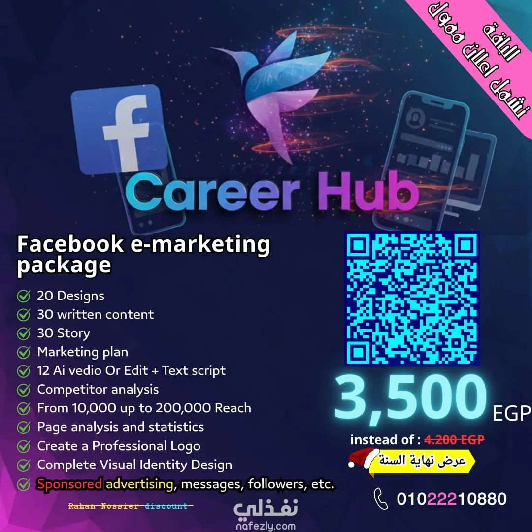 نحن في **Career Hub** نقدم لك باقة تسويقية متكاملة تهدف إلى تحسين حضورك الرقمي وتحقيق نتائج ملموسة على منصات التواصل الاجتماعي. من خلال تصميمات مبتكرة، محتوى مميز، وخطط تسويقية مدروسة، نساعدك على جذب المتابعين الجدد وزيادة التفاعل بشكل ملحوظ.