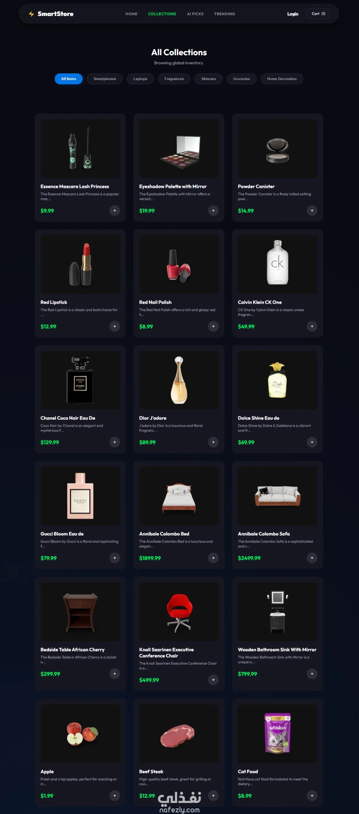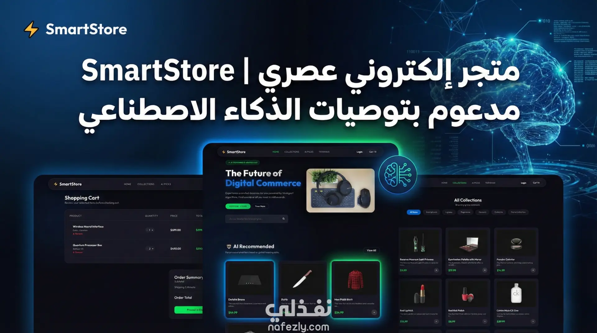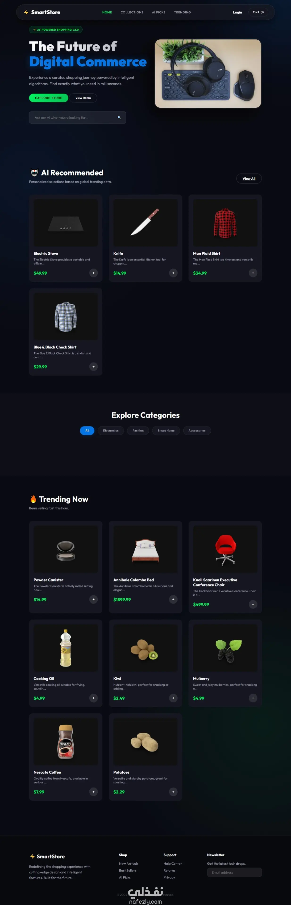 توصيات ذكية (AI Recommended): قسم خاص لاقتراح المنتجات بناءً على اهتمامات المستخدم.