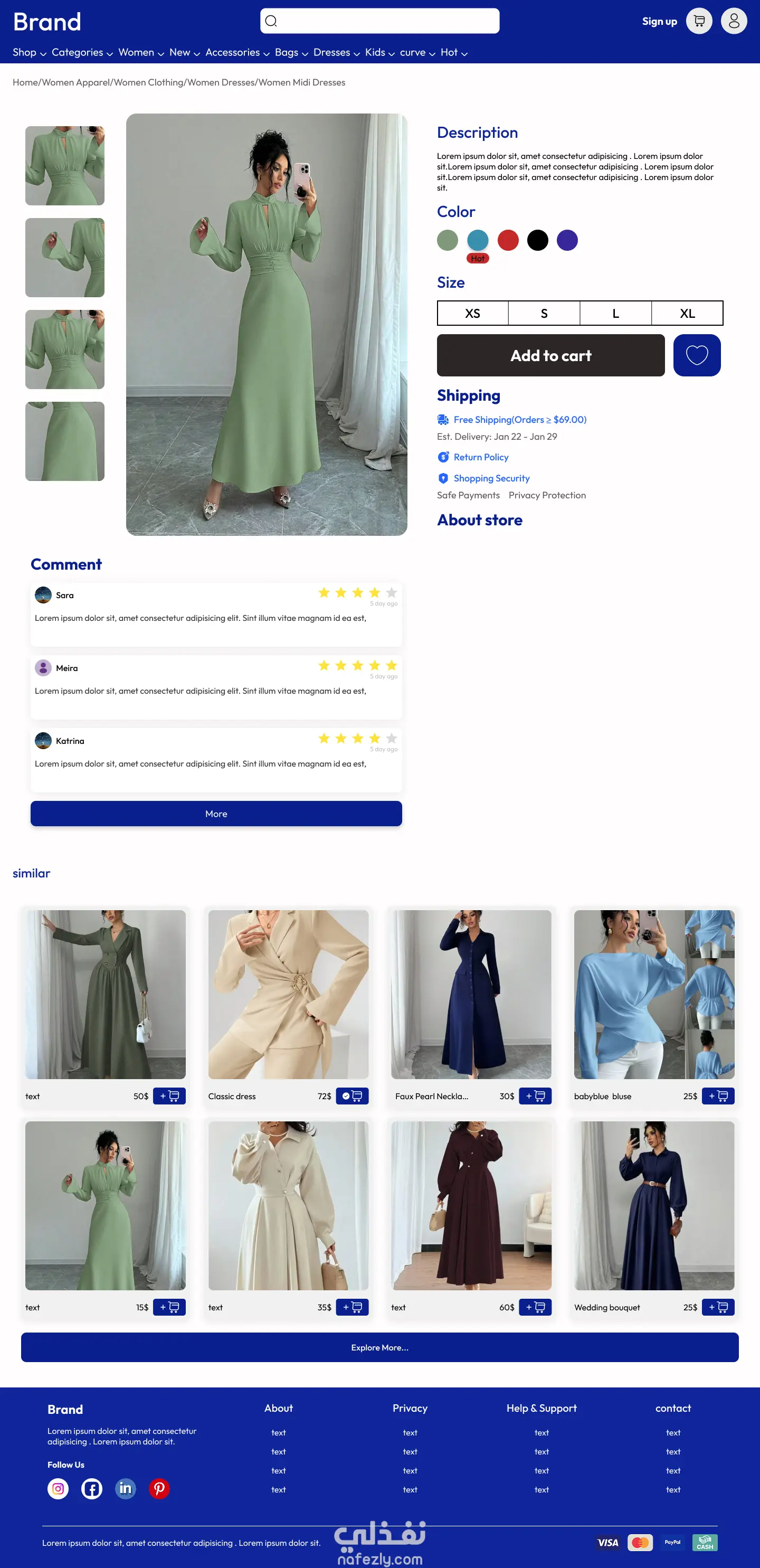تصميم صفحة المنتج مع معرض صور، اختيار اللون والمقاس، وزر تفاعلي