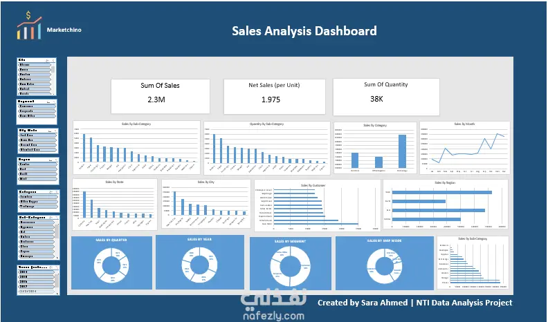 تفاصيل العمل تم تنفيذ مشروع تحليل بيانات المبيعات وتصميم داشبورد تفاعلية لعرض وتحليل أداء المبيعات بشكل شامل، مع التركيز على تتبع الإيرادات، الكميات المباعة، واتجاهات البيع عبر الفئات والمناطق والفترات الزمنية المختلفة، بهدف دعم اتخاذ قرارات دقيقة مبنية على البيانات. أهداف المشروع تحليل إجمالي المبيعات (Total Sales) حساب صافي المبيعات لكل وحدة (Net Sales per Unit) تحليل إجمالي الكميات المباعة معرفة أفضل الفئات والمنتجات أداءً تحليل المبيعات حسب المنطقة والمدينة تتبع اتجاه المبيعات شهريًا وسنويًا مقارنة أداء المبيعات عبر القطاعات المختلفة مؤشرات الأداء الرئيسية (KPIs) Sum of Sales Net Sales (per Unit) Sum of Quantity تم عرض المؤشرات في Cards واضحة في أعلى الداشبورد لتسهيل القراءة السريعة. التحليلات والرسوم البيانية تحتوي الداشبورد على مجموعة من التصورات التفاعلية، من بينها: المبيعات حسب الفئة (Category) الكميات المباعة حسب الفئة المبيعات حسب المنتج اتجاه المبيعات حسب الشهور المبيعات حسب الولاية والمدينة المبيعات حسب العميل المبيعات حسب المنطقة تحليل المبيعات حسب: الربع السنوي السنة القطاع (Segment) طريقة الشحن (Ship Mode) التفاعل وسهولة الاستخدام فلاتر تفاعلية للتحكم في: التاريخ الفئة المنطقة العميل تحديث تلقائي لجميع الرسوم عند تغيير الفلاتر تصميم منظم وواضح يناسب الإدارة وغير المتخصصين الأدوات والتقنيات المستخدمة Microsoft Excel Power Query لتنظيف البيانات مبادئ Data Visualization الاحترافية ✅ مخرجات المشروع داشبورد مبيعات تفاعلية احترافية تحليل شامل وقابل للتطوير دعم اتخاذ القرار بناءً على البيانات تصميم واضح ومتناسق بصريًا