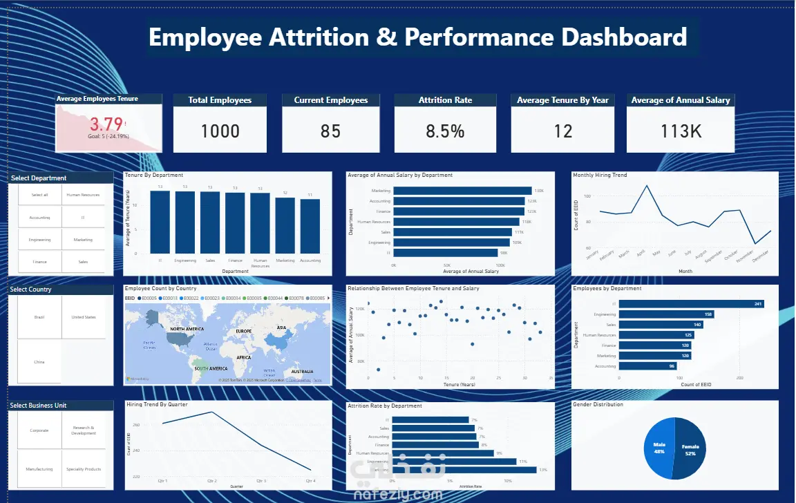 تفاصيل العمل تم تنفيذ مشروع تحليل بيانات الموارد البشرية (HR Analytics) وتصميم داشبورد تفاعلية لقياس معدل دوران الموظفين (Attrition) وتحليل الأداء العام للموظفين، بهدف مساعدة الإدارة على فهم أسباب التسرب الوظيفي، تقييم الاستقرار الوظيفي، ودعم اتخاذ قرارات استراتيجية مبنية على البيانات. أهداف المشروع تحليل إجمالي وعدد الموظفين الحاليين قياس معدل دوران الموظفين (Attrition Rate) تحليل متوسط مدة بقاء الموظف (Tenure) دراسة العلاقة بين مدة الخدمة والرواتب تحليل الرواتب حسب الأقسام متابعة اتجاهات التوظيف شهريًا وربع سنويًا مقارنة معدلات التسرب بين الأقسام المختلفة تحليل التوزيع الجغرافي والنوعي للموظفين مؤشرات الأداء الرئيسية (KPIs) Total Employees Current Employees Attrition Rate Average Employee Tenure Average Tenure by Year Average Annual Salary تم عرض المؤشرات في Cards واضحة لسهولة المتابعة السريعة من قبل الإدارة. التحليلات والرسوم البيانية تتضمن الداشبورد مجموعة من التصورات التفاعلية، من بينها: مدة بقاء الموظفين حسب القسم متوسط الرواتب السنوية حسب القسم اتجاه التوظيف الشهري عدد الموظفين حسب القسم خريطة توزيع الموظفين حسب الدولة العلاقة بين مدة الخدمة والراتب اتجاه التوظيف حسب الربع السنوي معدل دوران الموظفين حسب القسم توزيع الموظفين حسب النوع (ذكور / إناث) التفاعل وسهولة الاستخدام فلاتر تفاعلية حسب: القسم الدولة وحدة العمل (Business Unit) تحديث تلقائي لجميع الرسوم عند تغيير الفلاتر تصميم واضح يناسب فرق الـ HR والإدارة العليا الأدوات والتقنيات المستخدمة Power BI Desktop Power Query لتنظيف ومعالجة البيانات DAX لحساب مؤشرات الموارد البشرية مبادئ Data Visualization الاحترافية ✅ مخرجات المشروع داشبورد موارد بشرية تفاعلية احترافية تحليل شامل لمعدل التسرب والأداء دعم قرارات التوظيف والاحتفاظ بالموظفين تصميم احترافي قابل للتطوير والتحديث