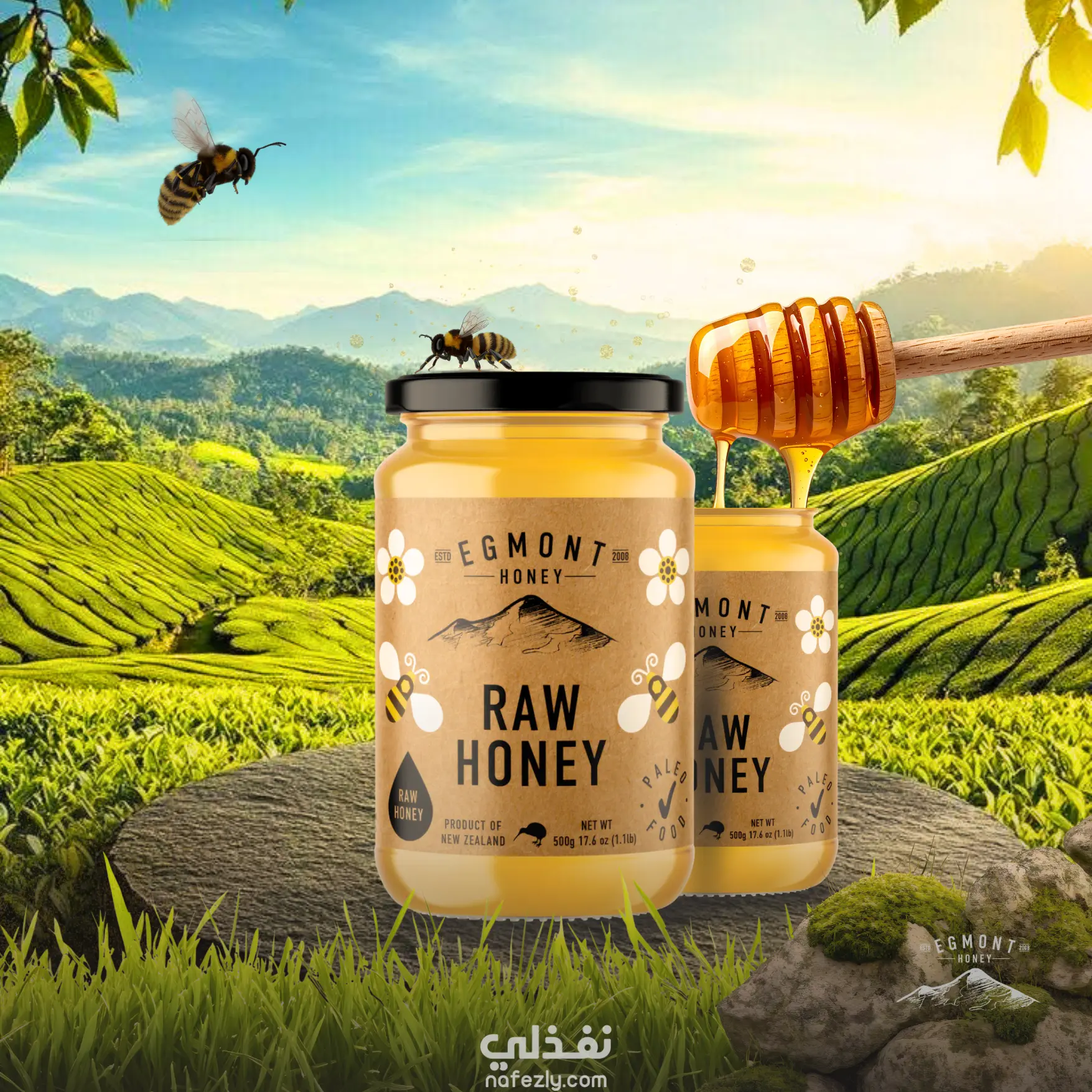 تصميم إعلاني متكامل لمنتج "Egmont Honey"، يهدف إلى إيصال رسالة النقاء والطبيعة المرتبطة بالمنتج من خلال بيئة بصرية خلابة. تم العمل على دمج المنتج في بيئة طبيعية (نيوزيلندا) لتعزيز هويته الأصلية. المهارات التقنية المنفذة: الدمج الرقمي (Photo Manipulation): دمج عبوات العسل مع عناصر الطبيعة مثل الصخور، النحل، والمناظر الجبلية بشكل متناغم. محاكاة السوائل: إضافة تأثير "ملعقة العسل" مع قطرات العسل المنسابة بدقة عالية لزيادة الجاذبية البصرية. الإضاءة والظلال: توزيع الإضاءة الشمسية المنبعثة من الخلف لتنسجم مع حواف المنتج والبيئة المحيطة، مما أعطى عمقاً وواقعية للتصميم. تصحيح الألوان (Color Grading): ضبط درجات اللون الأخضر والأصفر لخلق توازن مريح للعين يبرز لون العسل الذهبي.