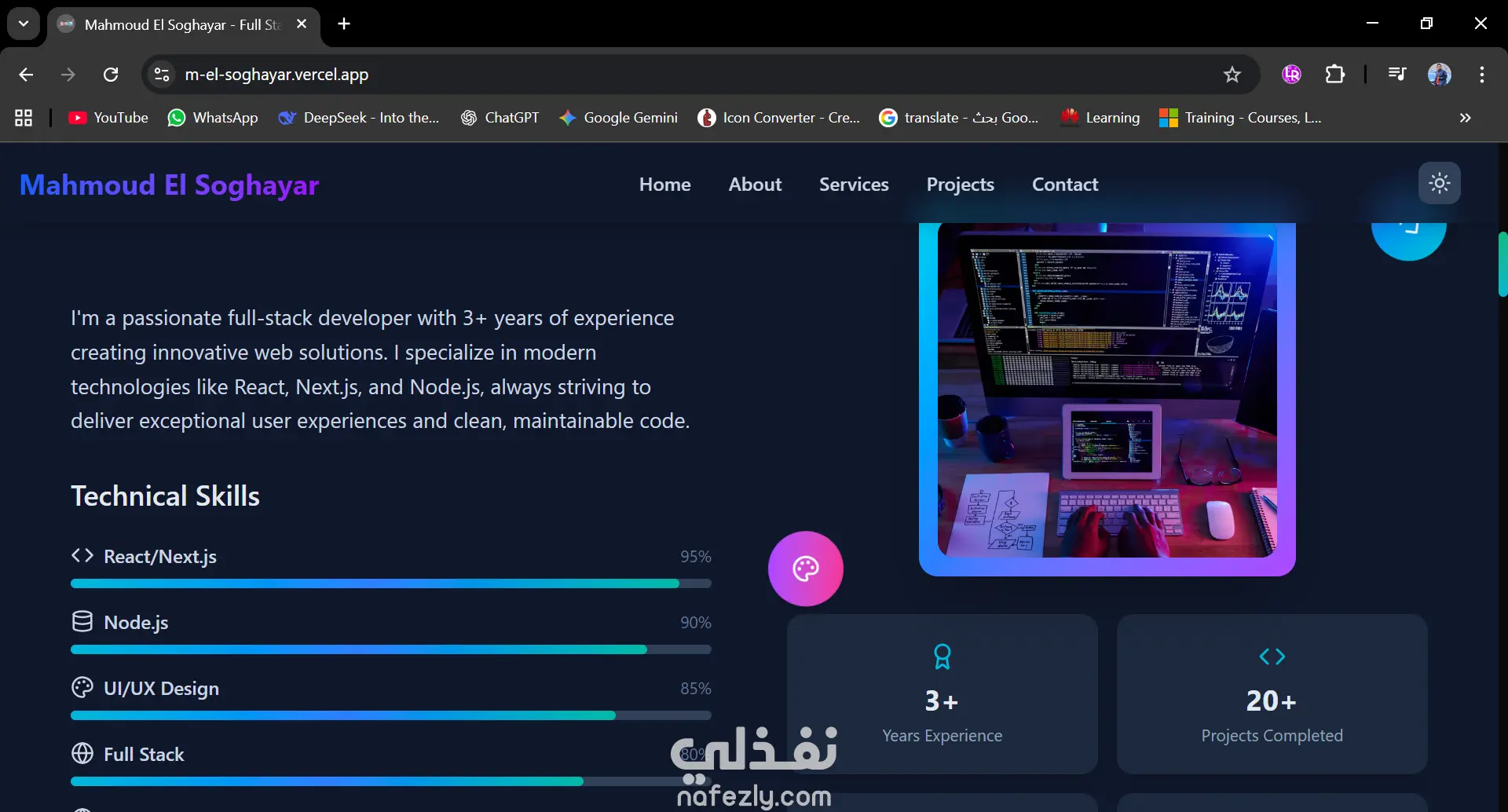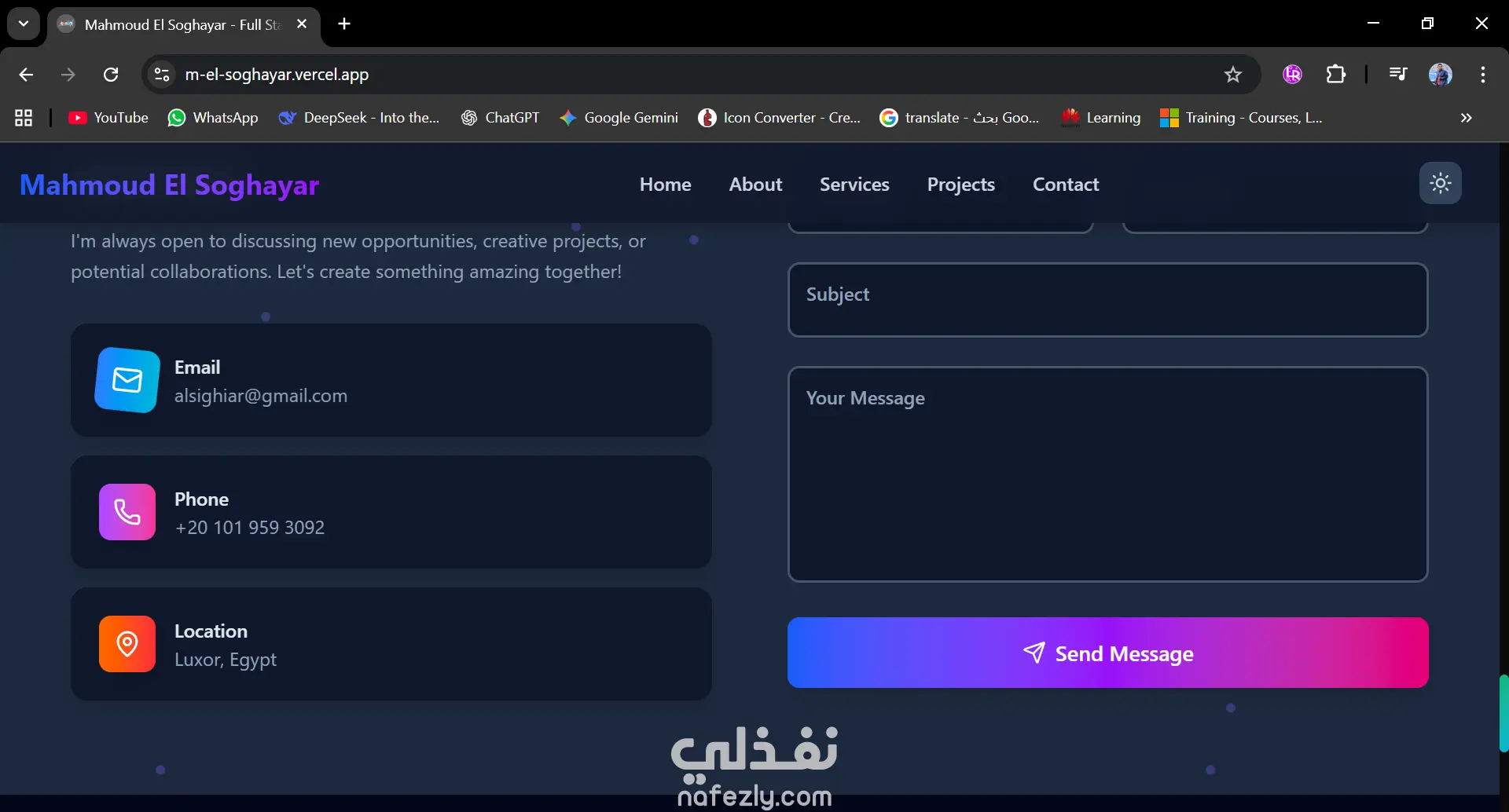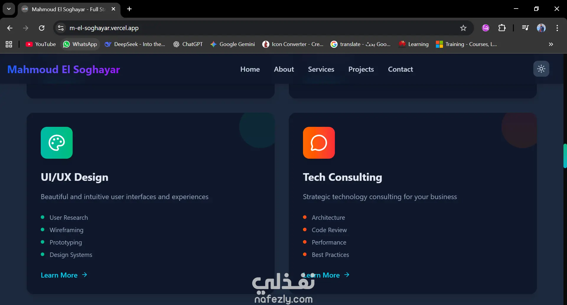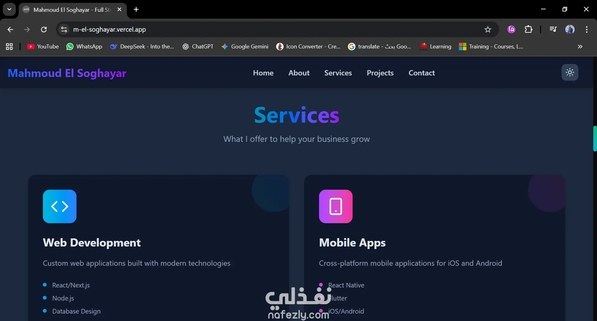 قمت بتصميم وتطوير موقع ويب متكامل ليكون معرض أعمال شخصي يستعرض المشاريع والمهارات بأسلوب عصري وجذاب. تم التركيز في هذا المشروع على الجمع بين الأداء العالي (Performance) وتجربة المستخدم السلسة، مع ضمان توافق كامل مع محركات البحث (SEO). باستخدام قوة Next.js في الرندرة من جهة الخادم (SSR) ومرونة Tailwind CSS في التصميم، نجحت في بناء منصة سريعة جداً توفر أفضل انطباع أول للزوار والعملاء المحتملين. أبرز المميزات والخصائص: سرعة صاروخية: تم استغلال ميزات Next.js لتحميل الصفحات بشكل فوري تقريباً. تصميم متجاوب (Responsive): الموقع متوافق تماماً مع جميع أحجام الشاشات (موبايل، تابلت، ديسكتوب). تحسين محركات البحث (SEO Optimized): استخدام بنية كود نظيفة ووسوم Meta Tags لضمان سهولة الأرشفة والظهور. واجهة مستخدم عصرية: تصميم "Minimalist" يركز على المحتوى والمشاريع، تم بناؤه من الصفر باستخدام Tailwind CSS. دعم الوضع الليلي (Dark Mode): إضافة خاصية التبديل بين الوضعين لراحة المستخدم. مكونات قابلة لإعادة الاستخدام: كتابة كود منظم يعتمد على React Components لتسهيل التطوير المستقبلي. التقنيات المستخدمة (Tech Stack): Frontend Framework: Next.js (React). Styling: Tailwind CSS (للتنسيق المخصص والاحترافي). Animations: Framer Motion Deployment: Vercel .