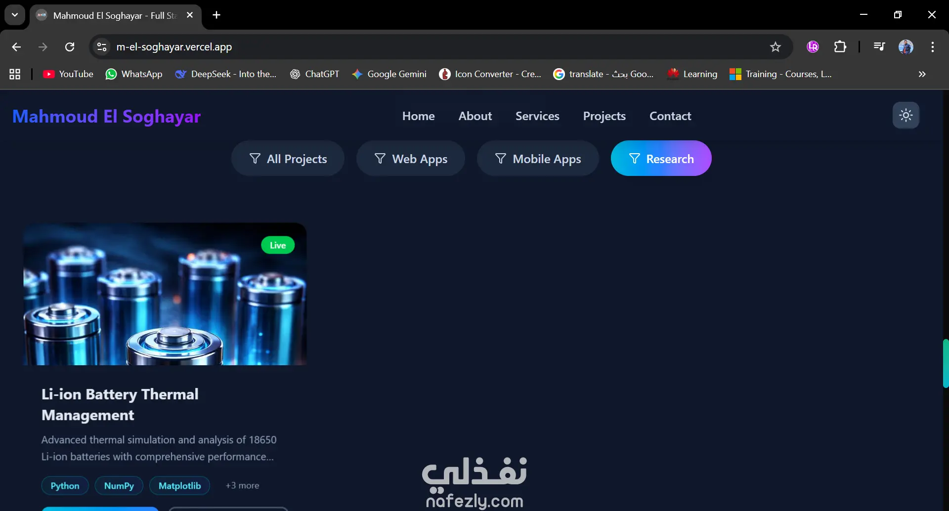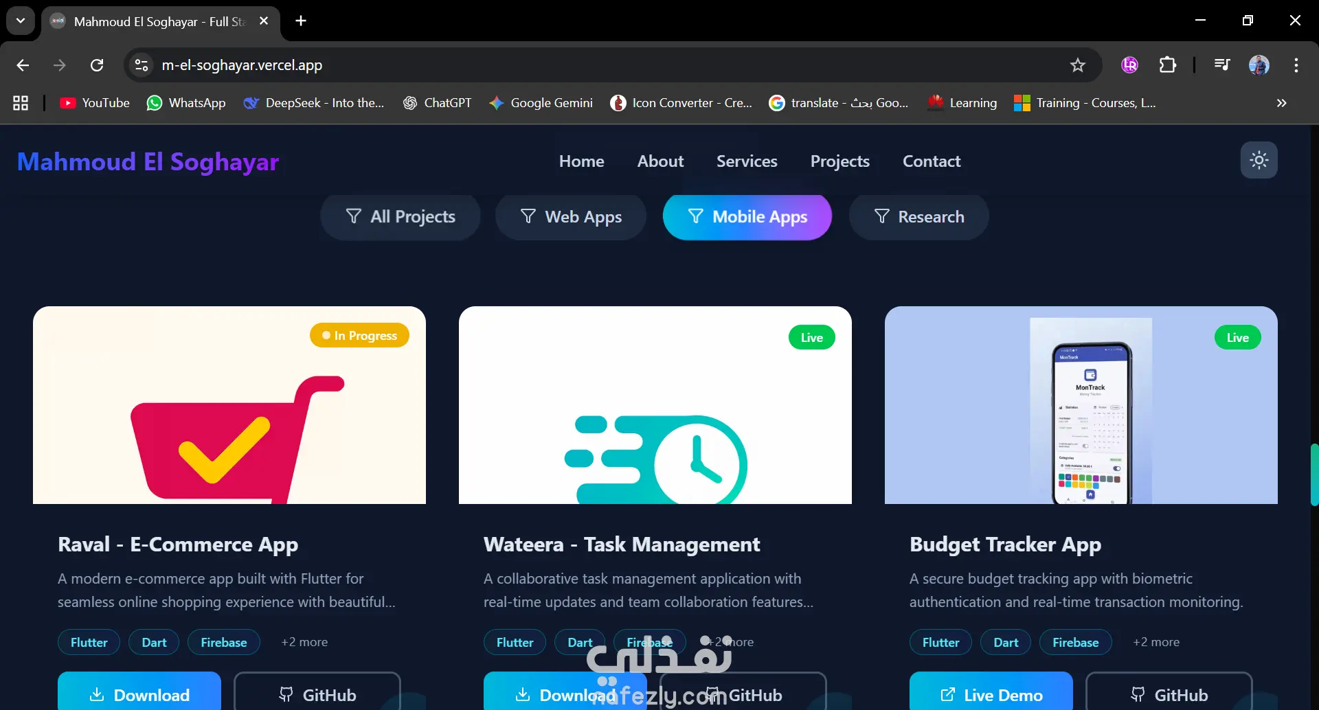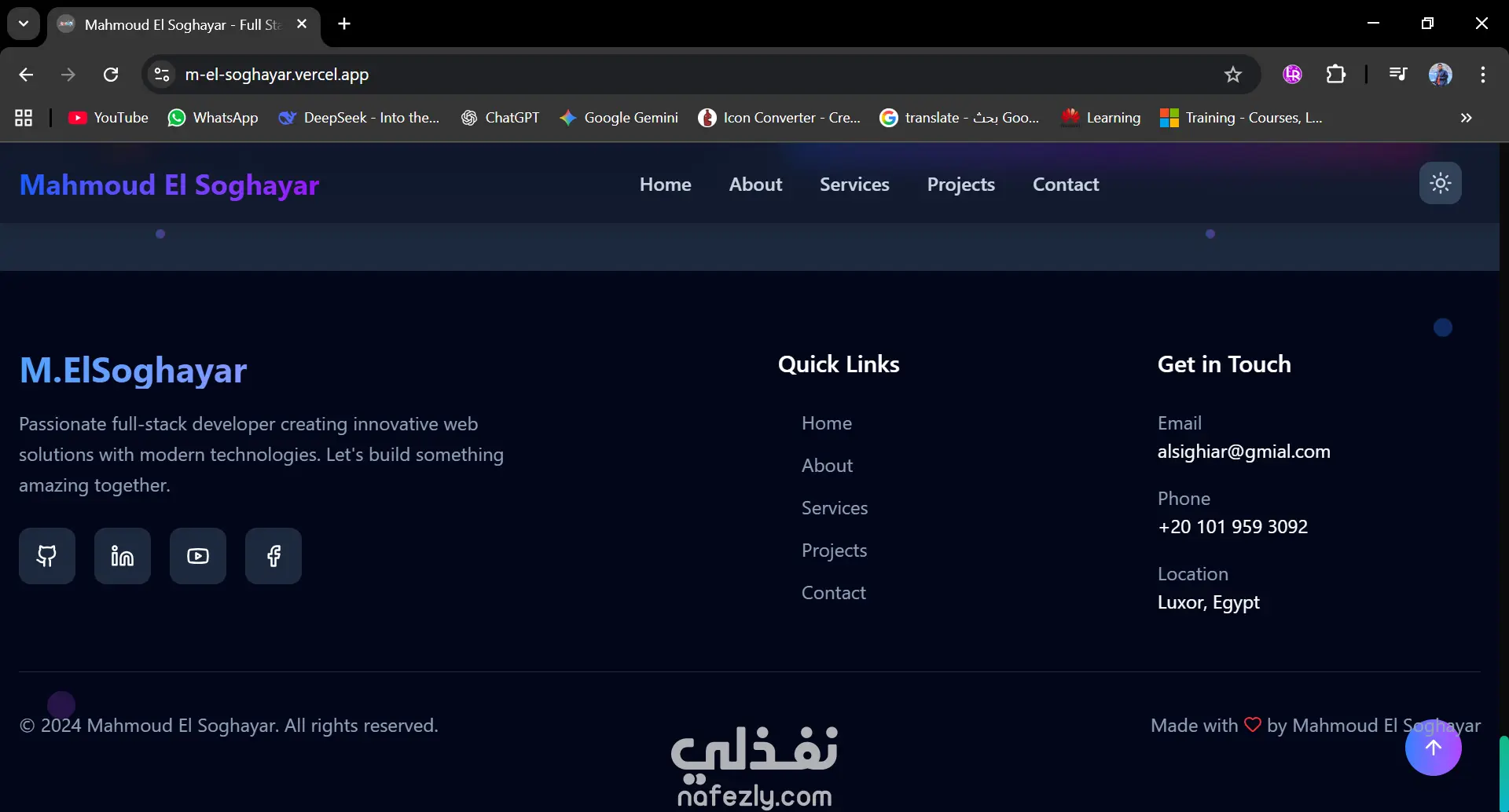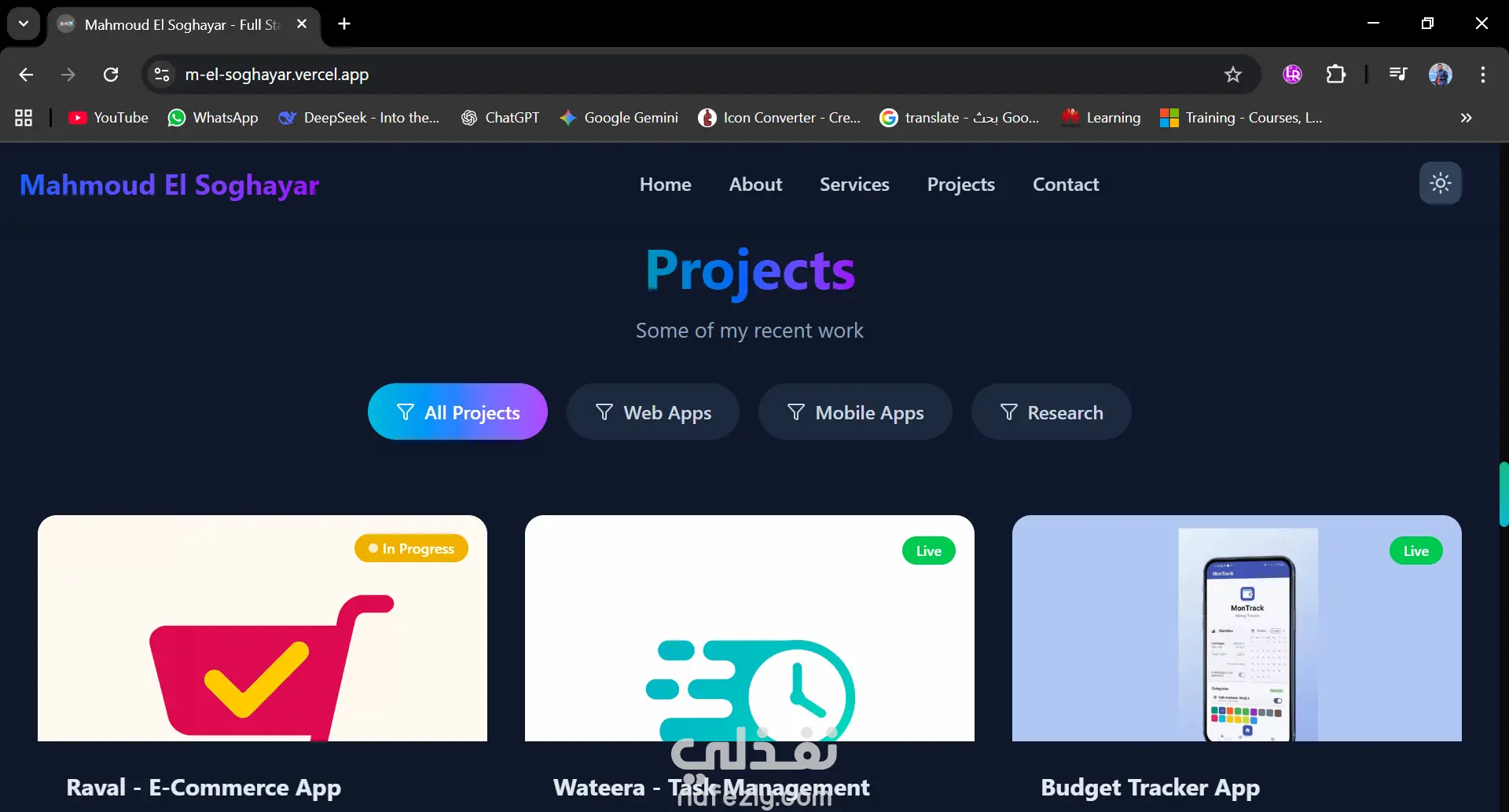 قمت بتصميم وتطوير موقع ويب متكامل ليكون معرض أعمال شخصي يستعرض المشاريع والمهارات بأسلوب عصري وجذاب. تم التركيز في هذا المشروع على الجمع بين الأداء العالي (Performance) وتجربة المستخدم السلسة، مع ضمان توافق كامل مع محركات البحث (SEO). باستخدام قوة Next.js في الرندرة من جهة الخادم (SSR) ومرونة Tailwind CSS في التصميم، نجحت في بناء منصة سريعة جداً توفر أفضل انطباع أول للزوار والعملاء المحتملين. أبرز المميزات والخصائص: سرعة صاروخية: تم استغلال ميزات Next.js لتحميل الصفحات بشكل فوري تقريباً. تصميم متجاوب (Responsive): الموقع متوافق تماماً مع جميع أحجام الشاشات (موبايل، تابلت، ديسكتوب). تحسين محركات البحث (SEO Optimized): استخدام بنية كود نظيفة ووسوم Meta Tags لضمان سهولة الأرشفة والظهور. واجهة مستخدم عصرية: تصميم "Minimalist" يركز على المحتوى والمشاريع، تم بناؤه من الصفر باستخدام Tailwind CSS. دعم الوضع الليلي (Dark Mode): إضافة خاصية التبديل بين الوضعين لراحة المستخدم. مكونات قابلة لإعادة الاستخدام: كتابة كود منظم يعتمد على React Components لتسهيل التطوير المستقبلي. التقنيات المستخدمة (Tech Stack): Frontend Framework: Next.js (React). Styling: Tailwind CSS (للتنسيق المخصص والاحترافي). Animations: Framer Motion Deployment: Vercel .