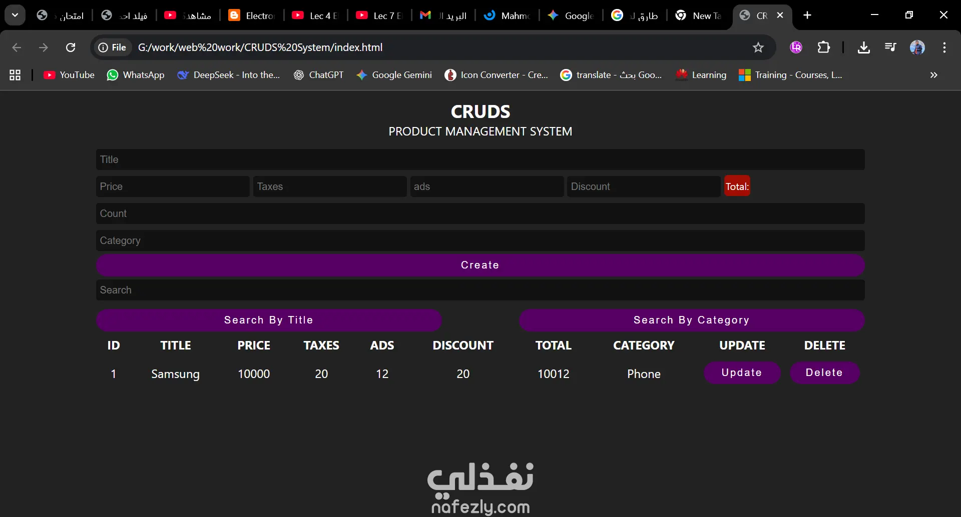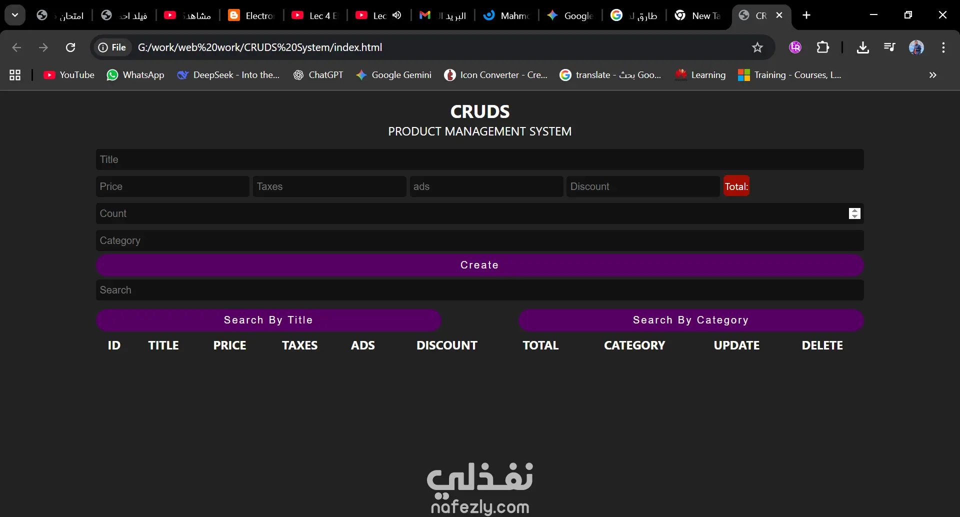 تطوير تطبيق ويب لإدارة [ذكر نوع البيانات، مثل: المهام/ المنتجات/ المستخدمين] يعتمد على العمليات الأربع الأساسية (CRUD). تم بناء المشروع مع التركيز على "تجربة مستخدم" سلسة و"كود نظيف" قابل للتوسع، مما يجعله نموذجاً مثالياً لأنظمة الإدارة المصغرة. المميزات التقنية: إدارة البيانات: إمكانية إضافة السجلات وتحديثها في الوقت الفعلي مع عرض فوري للتغييرات. البحث والفلترة: نظام بحث سريع للعثور على البيانات بسهولة. التحقق من البيانات (Validation): ضمان إدخال البيانات بشكل صحيح ومنع الأخطاء البرمجية. تصميم متجاوب: يعمل بكفاءة عالية على الحواسيب والهواتف الذكية.