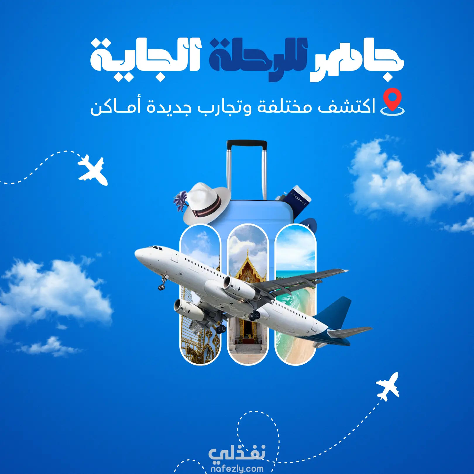 تصميم بوستر إعلاني مخصص لمنصات التواصل الاجتماعي يهدف إلى تحفيز الجمهور على السفر واستكشاف وجهات جديدة. تم الاعتماد على هوية بصرية تعكس الحرية والانطلاق باستخدام تدرجات اللون الأزرق. العناصر الفنية في التصميم: التكوين البصري (Composition): دمج حقيبة سفر تحتوي بداخلها على صور لوجهات سياحية مختلفة باستخدام تقنيات القناع (Masking) لإيصال فكرة "العالم داخل حقيبتك". عناصر الحركة: إضافة طائرة كعنصر أساسي مع خطوط مسار متقطعة وأيقونات سحاب لإضفاء ديناميكية وحيوية على التصميم. تنسيق النصوص (Typography): استخدام خطوط عربية عريضة وواضحة للعنوان الرئيسي لجذب الانتباه بشكل فوري. التوازن اللوني: اختيار خلفية زرقاء فاتحة تحاكي السماء، مما يبرز لون الطائرة الأبيض والحقيبة الزرقاء بشكل متناغم.