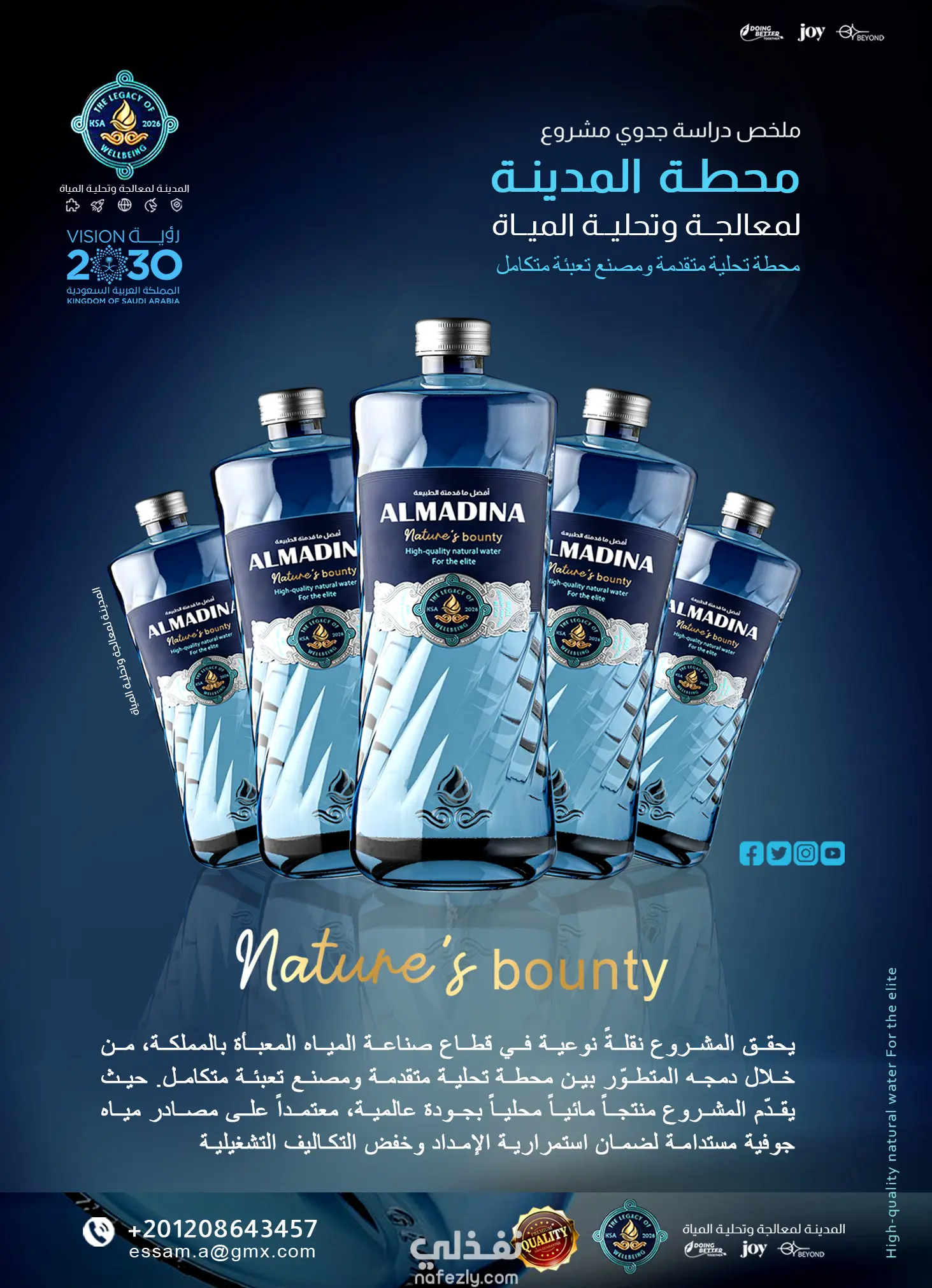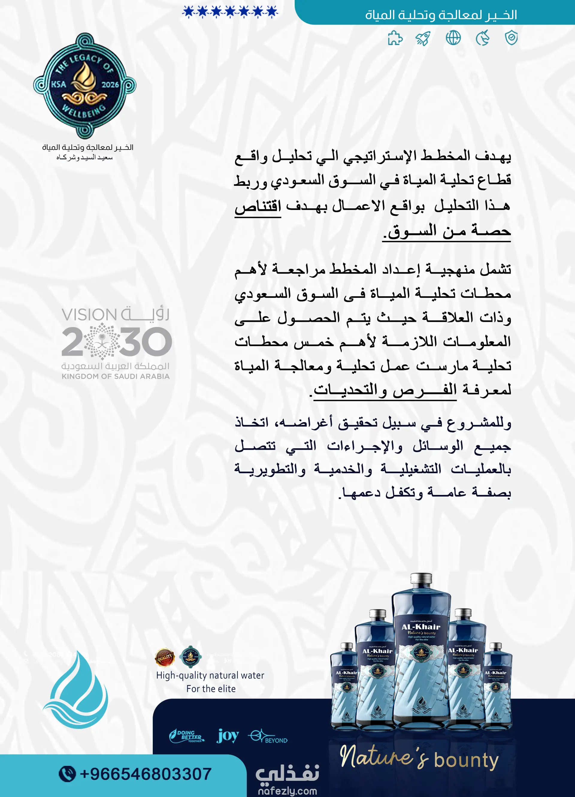 يحقق المشروع نقلةً نوعية في قطاع صناعة المياه المعبأة بالمملكة، من خلال دمجه المتطوّر بين محطة تحلية متقدمة ومصنع تعبئة متكامل. حيث يقدّم المشروع منتجاً مائياً محلياً بجودة عالمية، معتمداً على مصادر مياه جوفية مستدامـة لضمـان استمراريـة الإمـداد وخفض التكـاليف التشغيليـة