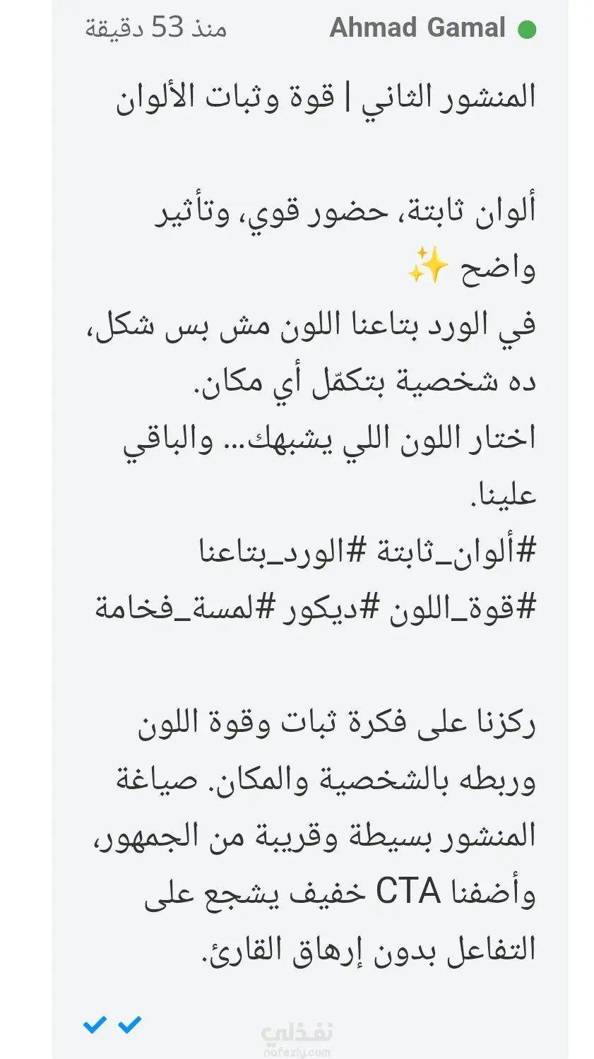 قمت بكتابة وصياغة منشورات تسويقية لمنتجات الورد، ركزت فيها على إبراز جودة الخامة، ثبات اللون، وتنوع الأشكال بطريقة جذابة وبسيطة. اعتمدت على أسلوب عاطفي يربط المنتج بالمشاعر والمناسبات، مع استخدام عناوين لافتة تحفّز التفاعل وتشد الانتباه من أول سطر. حرصت على أن تكون اللغة سهلة وقريبة من الجمهور المستهدف، مع تضمين دعوات مباشرة وغير مباشرة للتعليق والمشاركة. ساهمت هذه المنشورات في زيادة التفاعل ورفع الاهتمام بالمنتج وتعزيز صورته كخيار أنيق للهدايا والديكور.