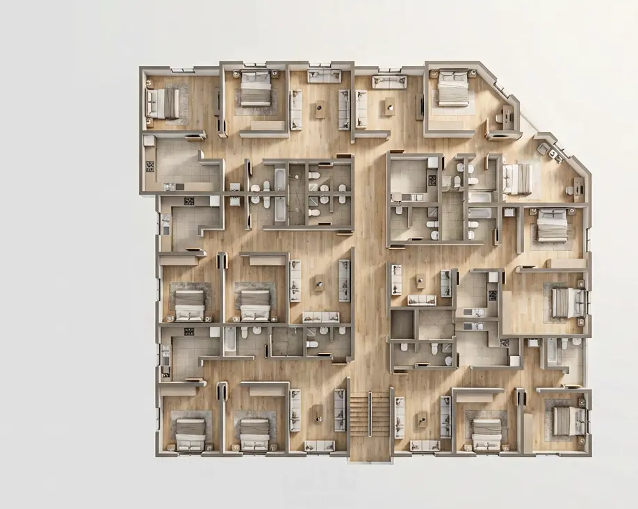 التنسيق المعماري مع عناصر السلالم، المصاعد، الخدمات، ومناطق الحركة الرأسية والأفقية.