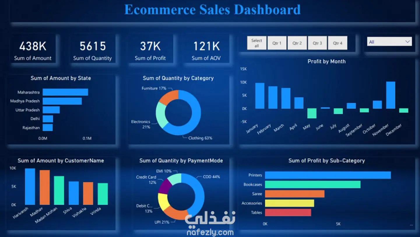 The Ecommerce Sales Dashboard project is designed to provide a comprehensive overview of business performance in the online retail sector. It consolidates sales, profit, and customer data into a single interactive platform, enabling management and stakeholders to make data-driven decisions effectively. This dashboard highlights key performance indicators (KPIs), such as total sales amount, quantity sold, profit, and average order value. It provides detailed insights into sales trends across different states, product categories, sub-categories, customers, and payment modes. Additionally, it tracks profit fluctuations over time, helping to identify seasonal trends and periods of loss. Key features of the dashboard include: State-wise sales performance to identify high-revenue regions. Category and sub-category analysis to evaluate best-selling and most profitable products. Customer-level insights to highlight top customers and their contribution to revenue. Payment mode analysis to understand customer preferences in transactions. Monthly profit tracking to detect trends, peaks, and losses in profitability. By providing these insights, the dashboard serves as a valuable tool for ecommerce businesses to optimize product strategies, enhance customer engagement, and improve overall profitability.