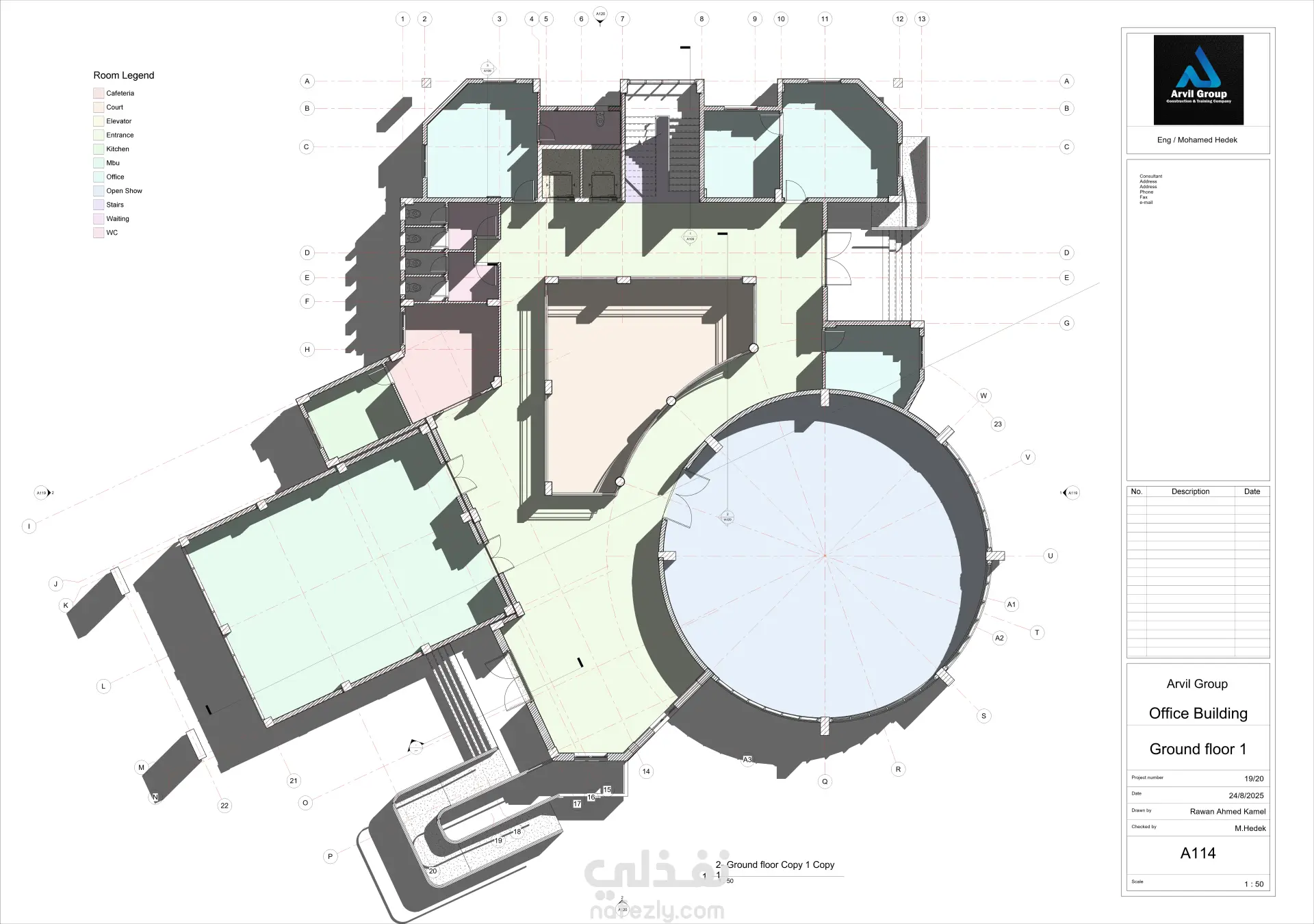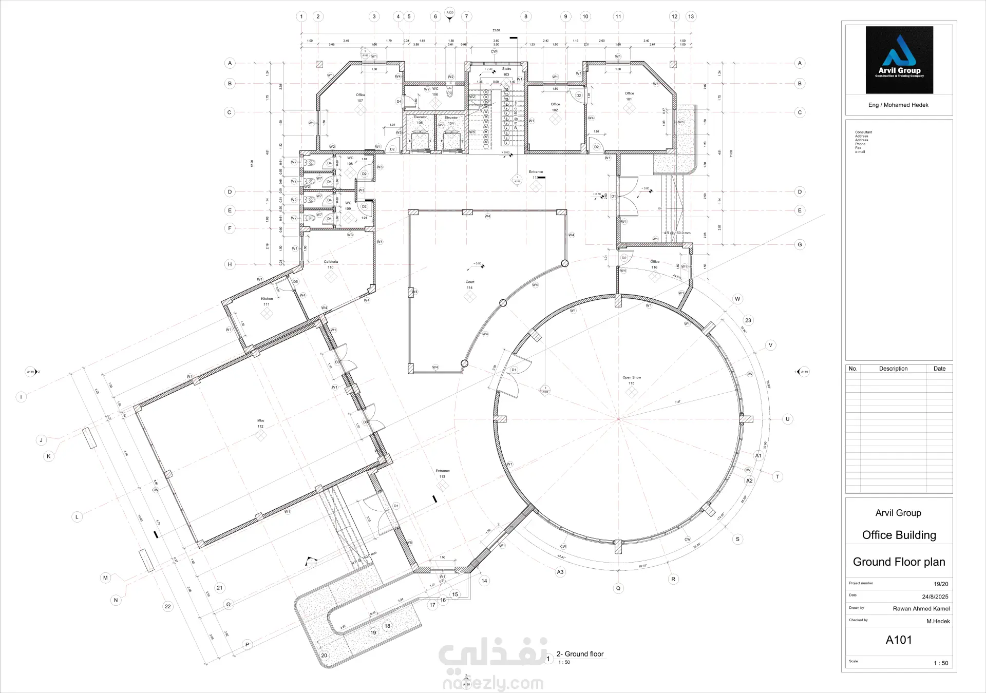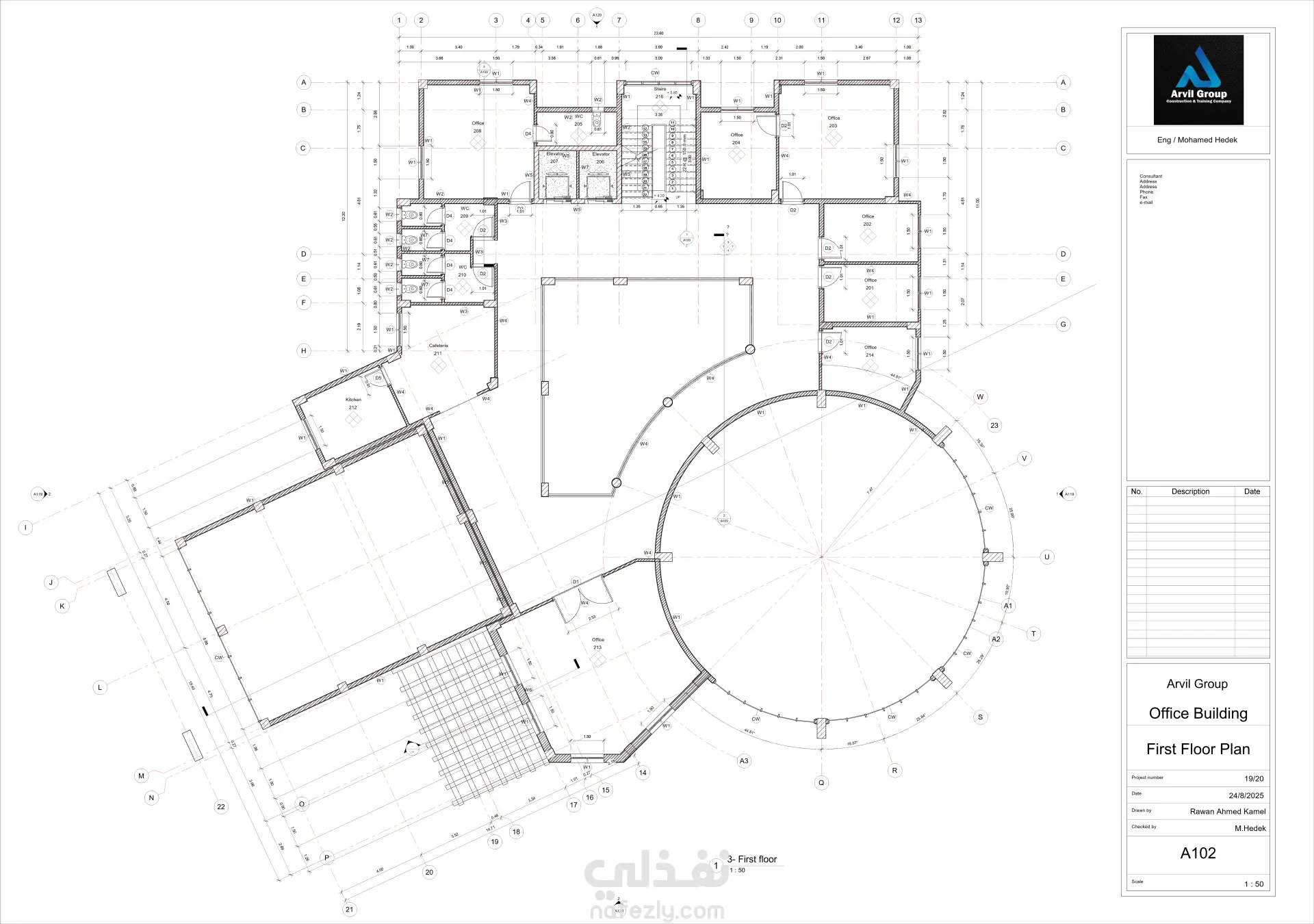 قمتُ بتصميم مبنى إداري حديث يهدف إلى توفير بيئة عمل متكاملة تجمع بين الكفاءة والراحة. ركزت في التصميم على تحقيق انسيابية الحركة بين الفراغات، مع توزيع واضح للأدوار بحيث يخدم كل طابق وظيفة محددة. يتكون المبنى من: مدخل رئيسي فخم مزود ببهو استقبال واسع للزوار. مكاتب إدارية متنوعة الأحجام تناسب فرق العمل والإدارات المختلفة. قاعات اجتماعات. مناطق خدمات تشمل دورات مياه، مطبخ صغير ،كافيتريا. ممرات مدروسة تحقق سهولة الحركة والربط بين الأقسام. مصاعد وسلالم لتحقق راحة الزوار والمتسخدمين تمت مراعاة عناصر الإضاءة الطبيعية والتهوية لخلق بيئة عمل صحية، مع تصميم واجهة خارجية عصرية تعكس هوية المبنى وتعطي طابعًا من الرقي والاحترافية.
