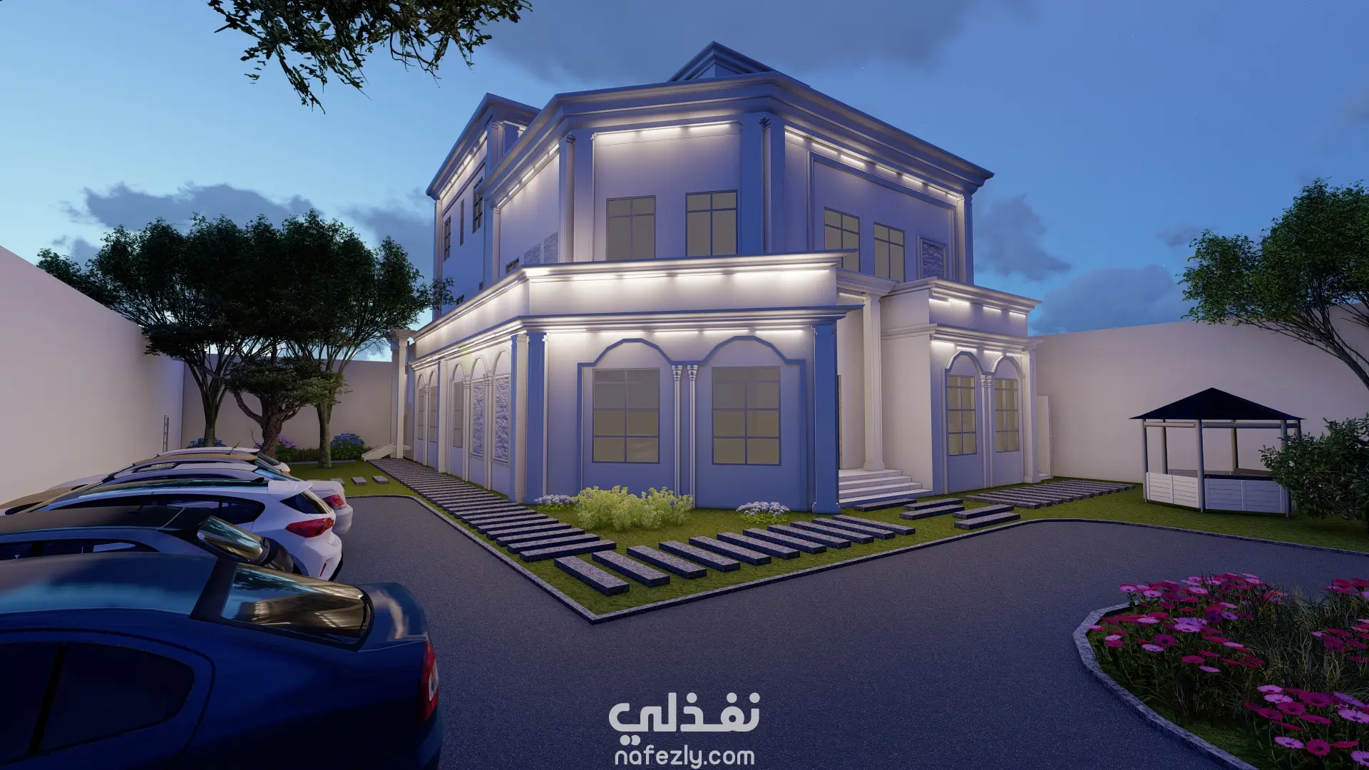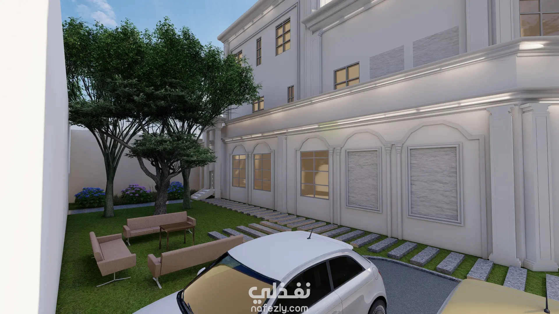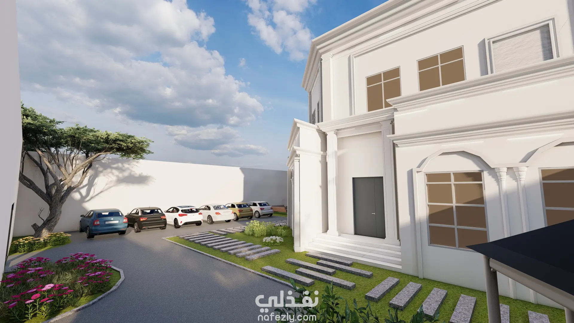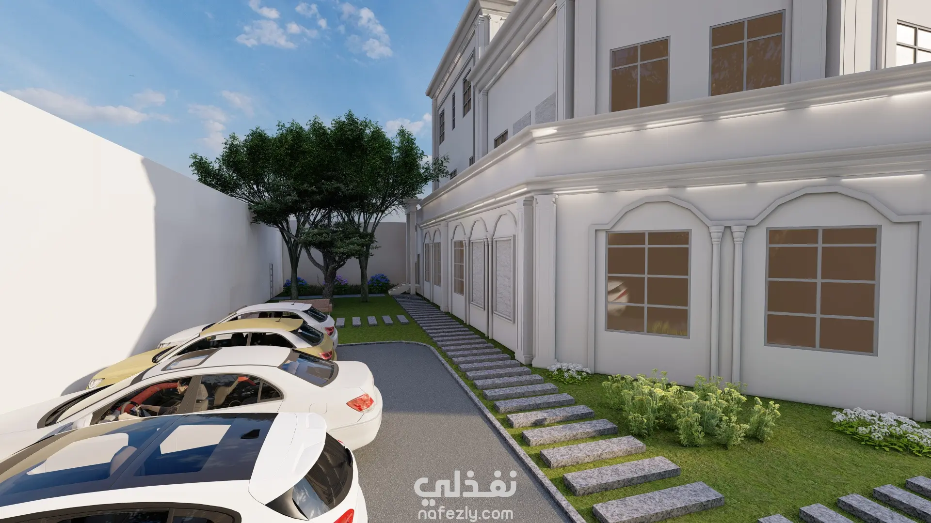 تم عمل واجهة الفيلا عللى ريفيت ثم عمل لاندسكيب يتناسب معاها والقيام بريندر واقعى لهم